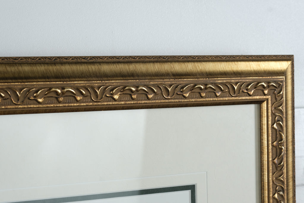 Double-matted in cream and green tones with ornate gold frame