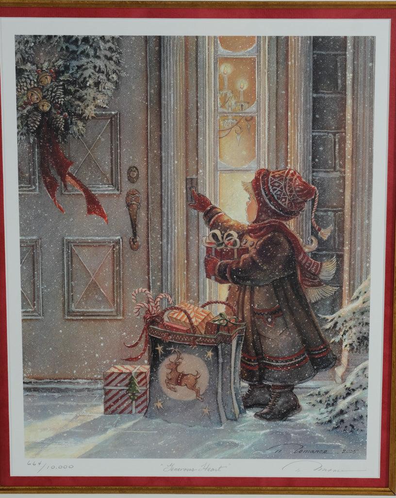 Hand-signed and dated 2005 by Trisha Romance, this collectible print is beautifully presented in a classic gold-tone frame with ivory and deep red double matting. A touching addition to any home or collection, Generous Heart evokes nostalgia and the heartfelt warmth of a Canadian Christmas.