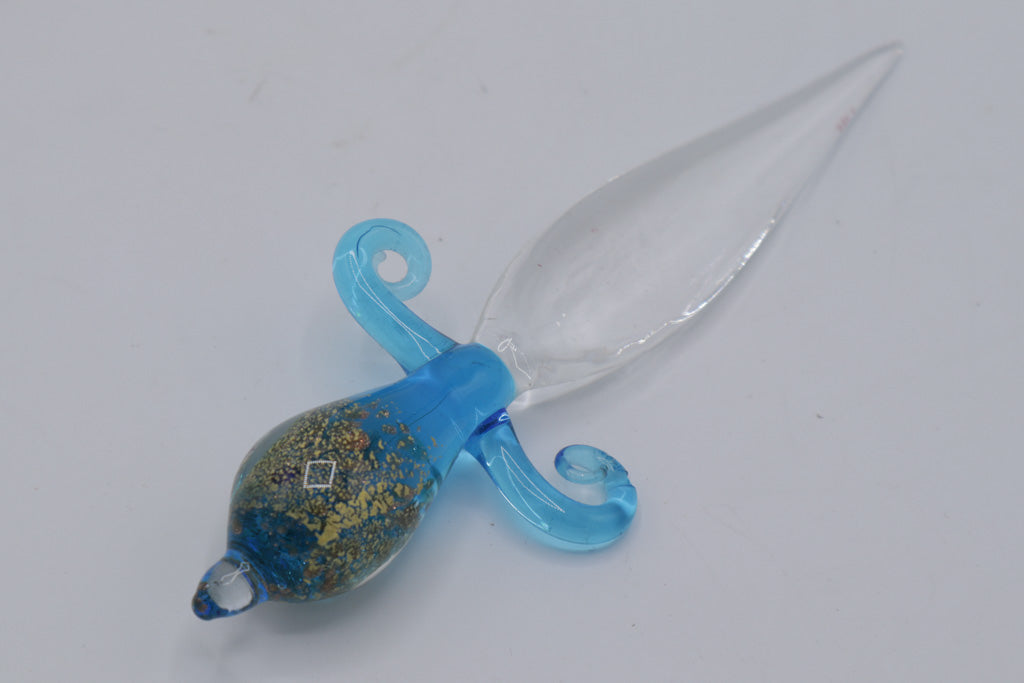 Add a touch of artistry to your desk with this hand-blown glass letter opener. The handle features a stunning blend of blue glass with shimmering gold flecks, accented by elegant curled side details. The blade is crafted from clear glass, tapering to a fine point, making it as decorative as it is functional.