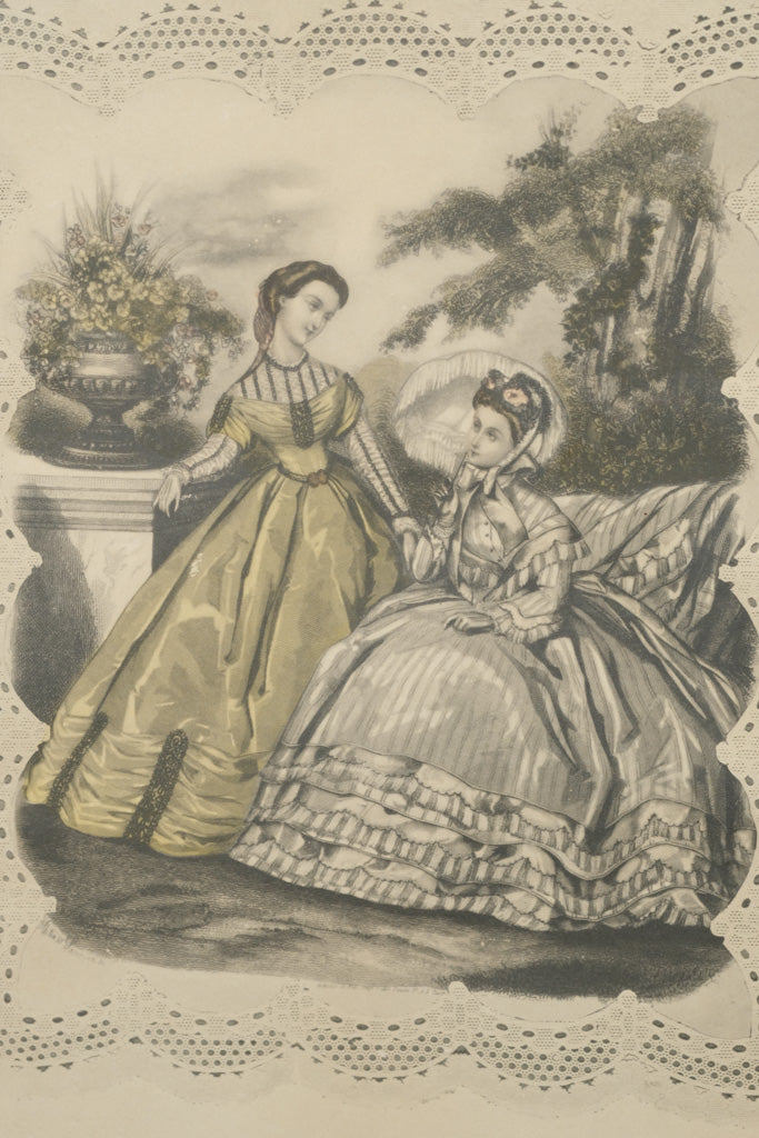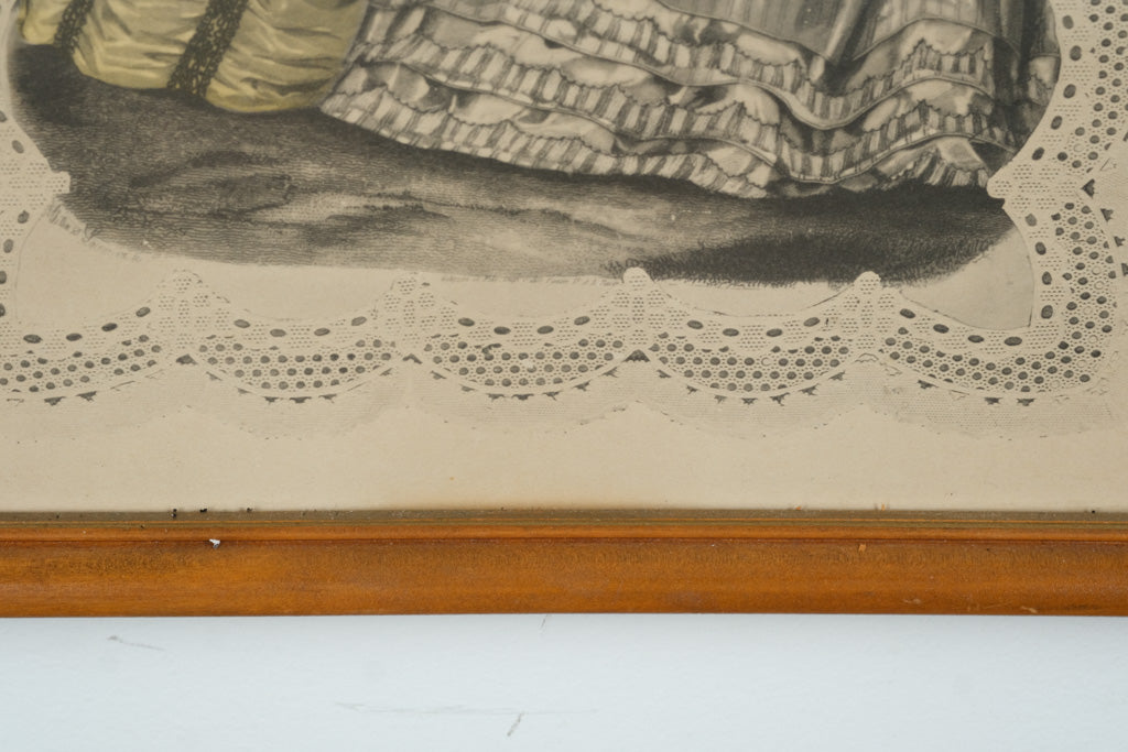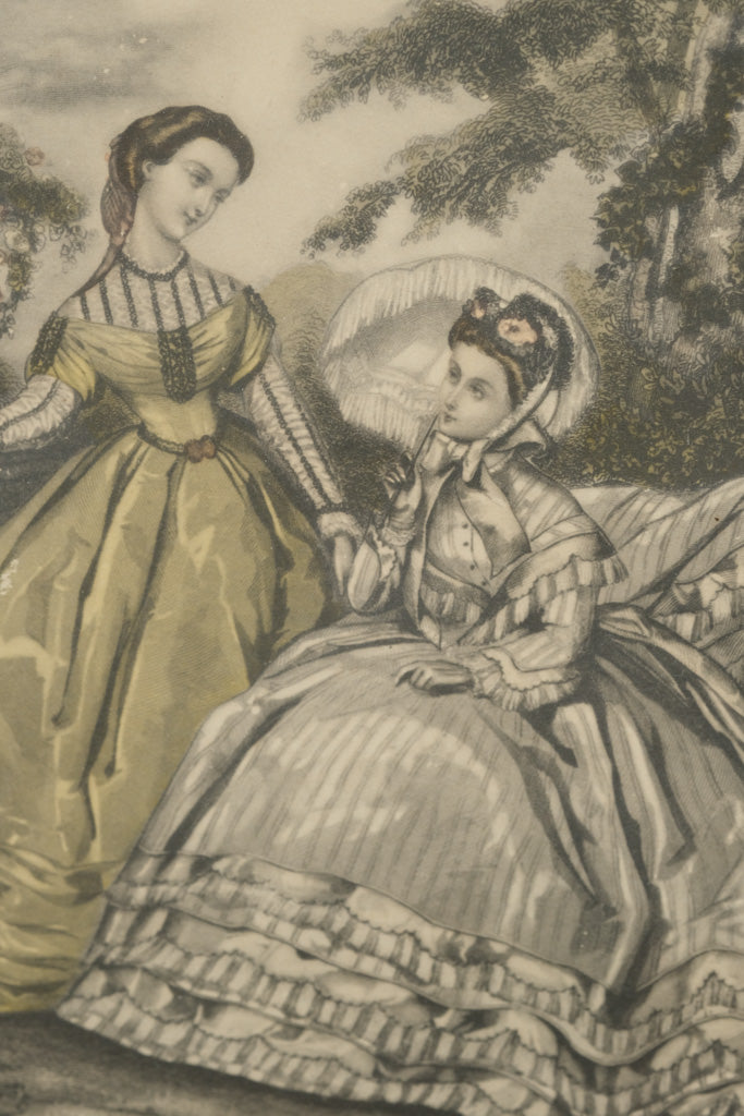 This framed hand-colored Godey’s fashion print features a lovely outdoor scene of two Victorian women—one standing gracefully in a golden gown and the other seated with a parasol in a soft striped dress. Their attire, posture, and setting reflect the refined fashion and genteel social life captured in 19th-century Godey’s Lady’s Book fashion plates.
