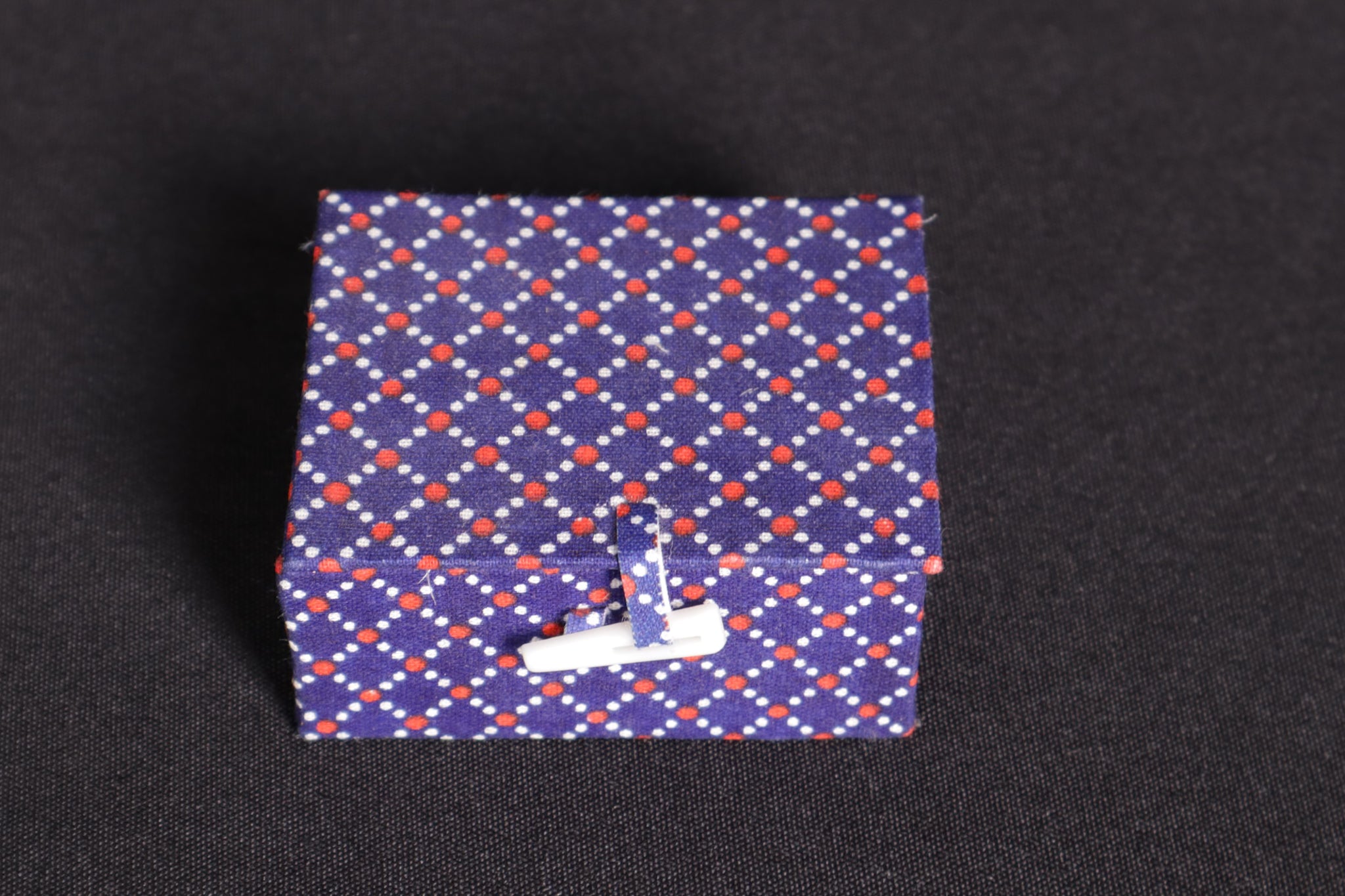 The bottle comes with its original fabric-covered storage box in a navy blue geometric pattern with a white clasp, making it a beautiful collectible or gift.