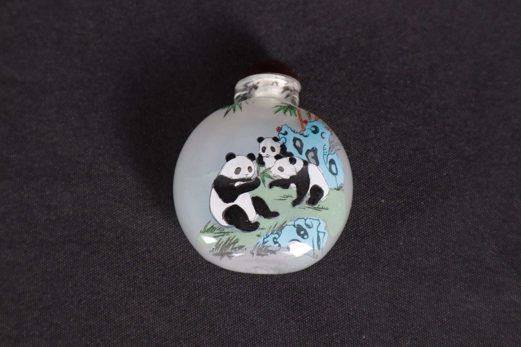 This charming snuff bottle set showcases the artistry of Chinese reverse painting inside glass. Each side features a detailed, hand-painted scene: one with the majestic Great Wall of China winding across the mountains, and the other with a delightful group of playful pandas among bamboo and rocks.