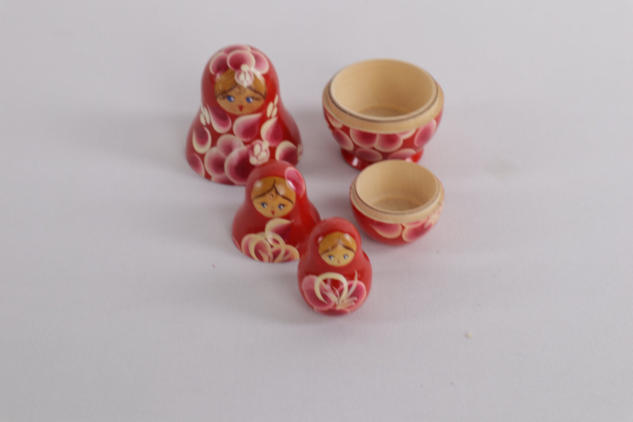 Bring a touch of folk art charm to your collection with this beautiful hand-painted Russian Matryoshka nesting doll set. Featuring a vibrant red base adorned with delicate pink and white floral patterns, each doll is carefully crafted and finished with glossy lacquer. The set includes six dolls in total, each fitting neatly inside the other, from the largest at 3" tall × 2.25" circumference to the smallest, only a fraction of an inch tall.