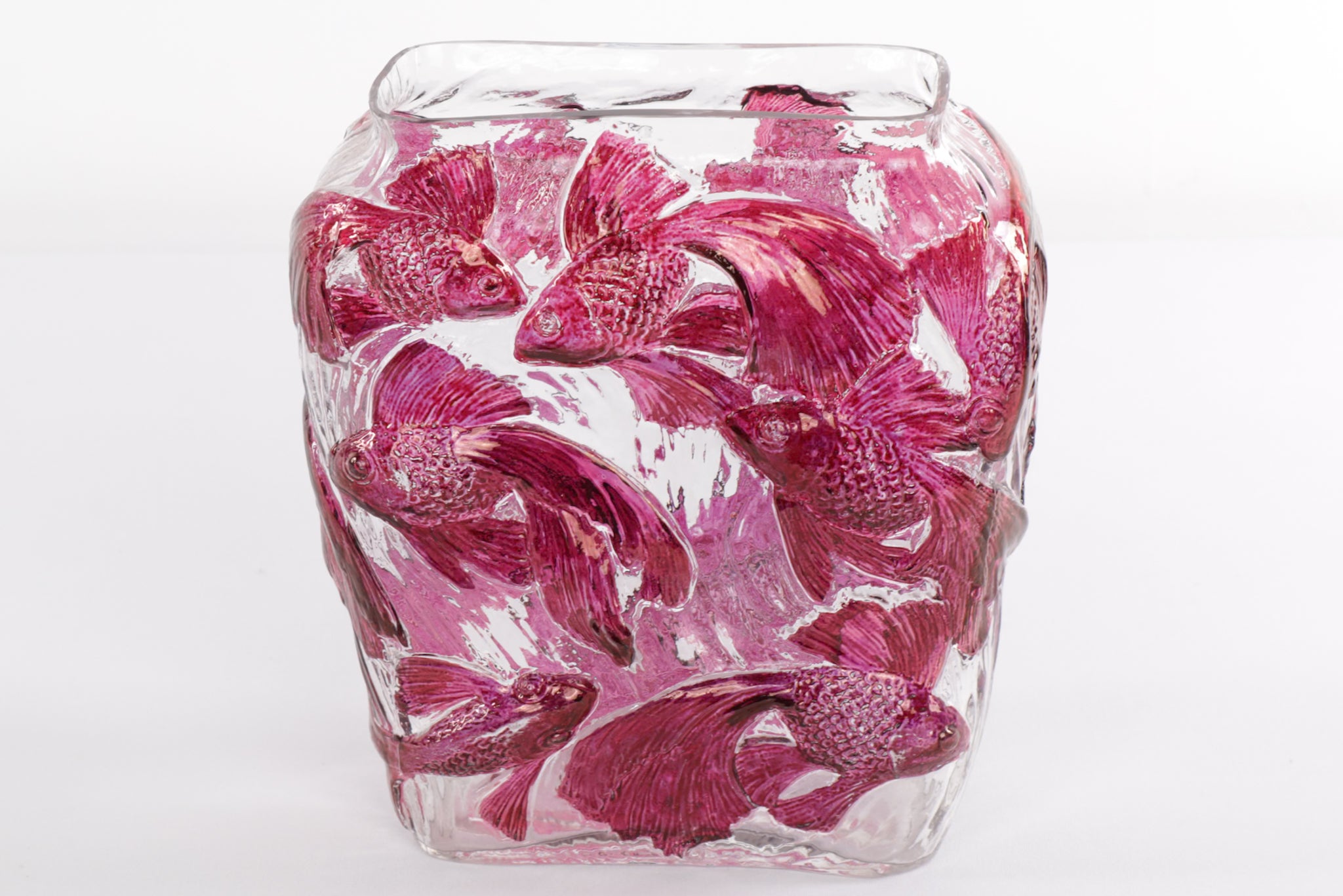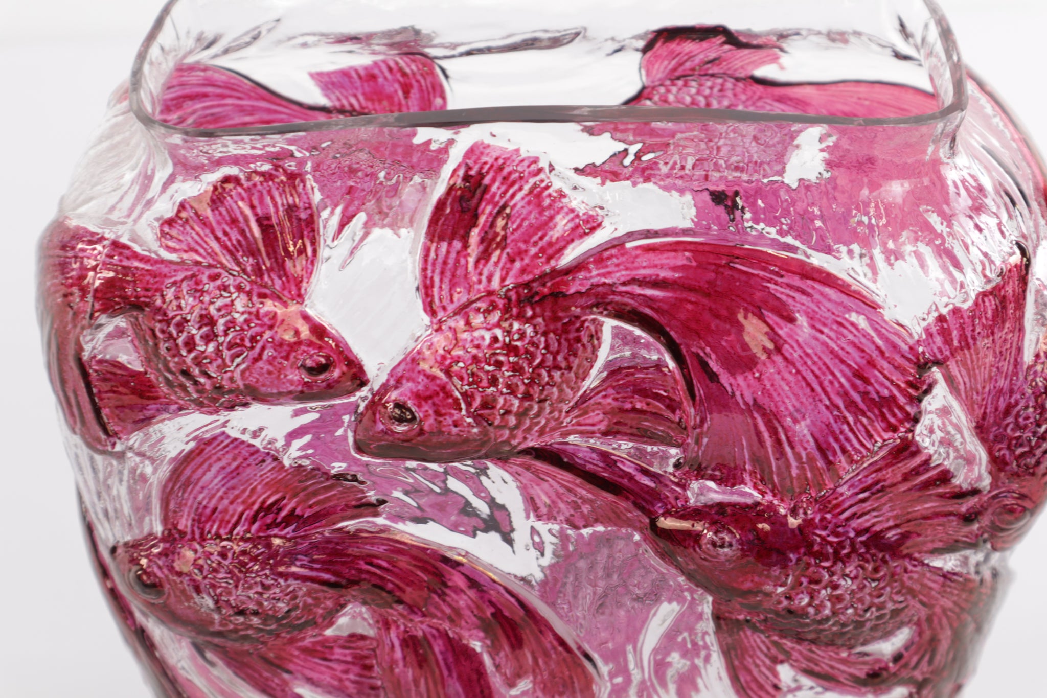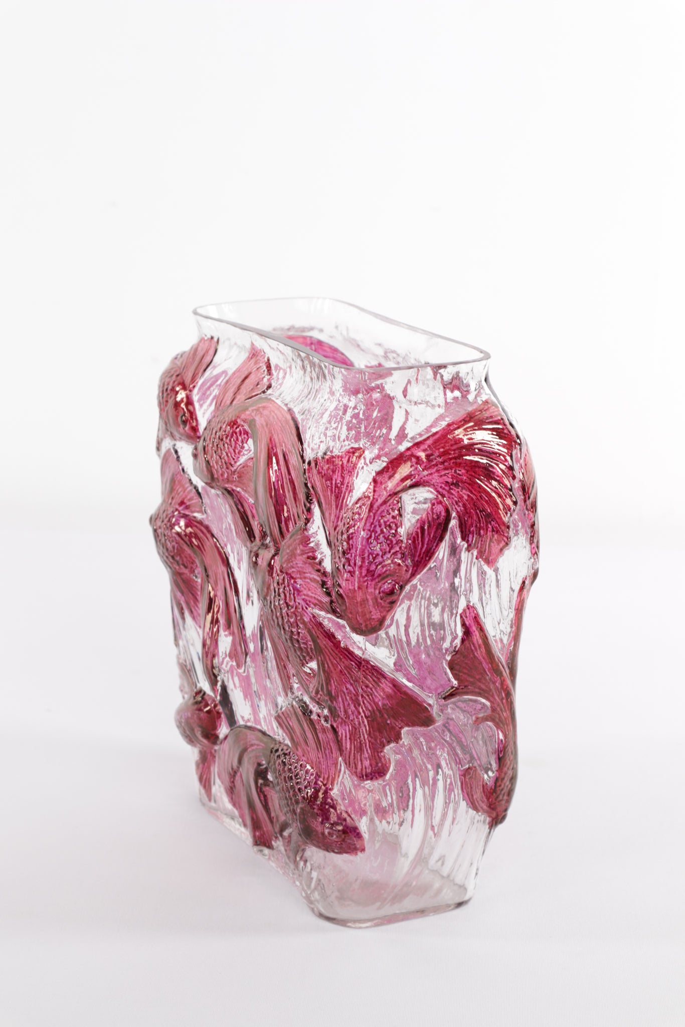 Bring artistry and elegance into your home with this stunning Handcrafted Glass Vase featuring a striking raised koi fish design in vivid shades of pink. Each side of the vase is adorned with intricately detailed fish swimming through textured glass, creating a dynamic and eye-catching 3D effect.