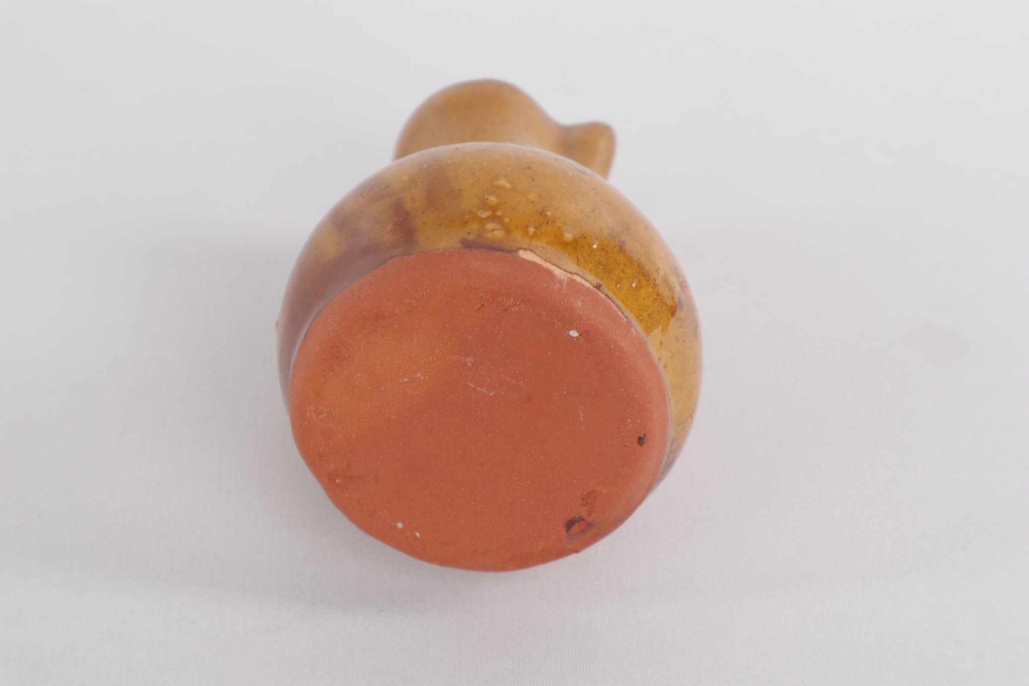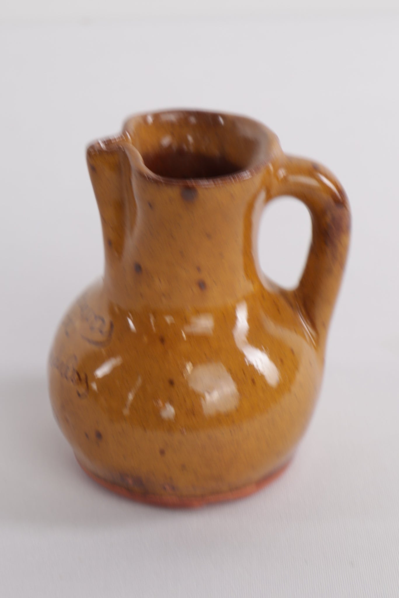 Finished in a warm, earthy brown glaze, the pitcher features a simple, rustic shape with a rounded body, spout, and side handle. Its petite size makes it perfect as a display piece, small vase, or unique addition to any pottery or travel memorabilia collection.