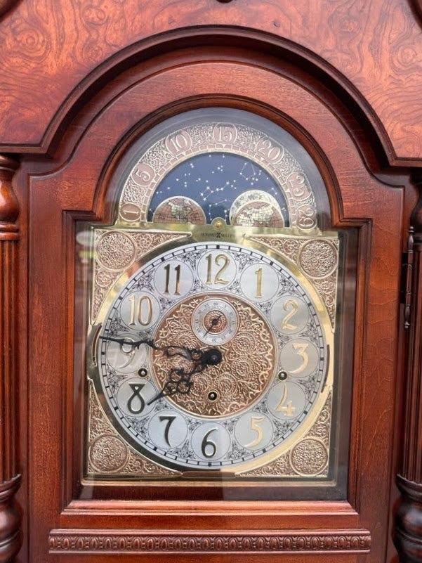 A magnificent statement of timeless craftsmanship, this Howard Miller grandfather clock embodies the elegance and precision that have made the brand synonymous with heirloom quality. Its stately presence, rich cherry-toned wood, and intricate brass details make it a centerpiece of sophistication for any home. Designed to combine classic beauty with mechanical artistry, it stands as both a functional timepiece and a piece of fine furniture.