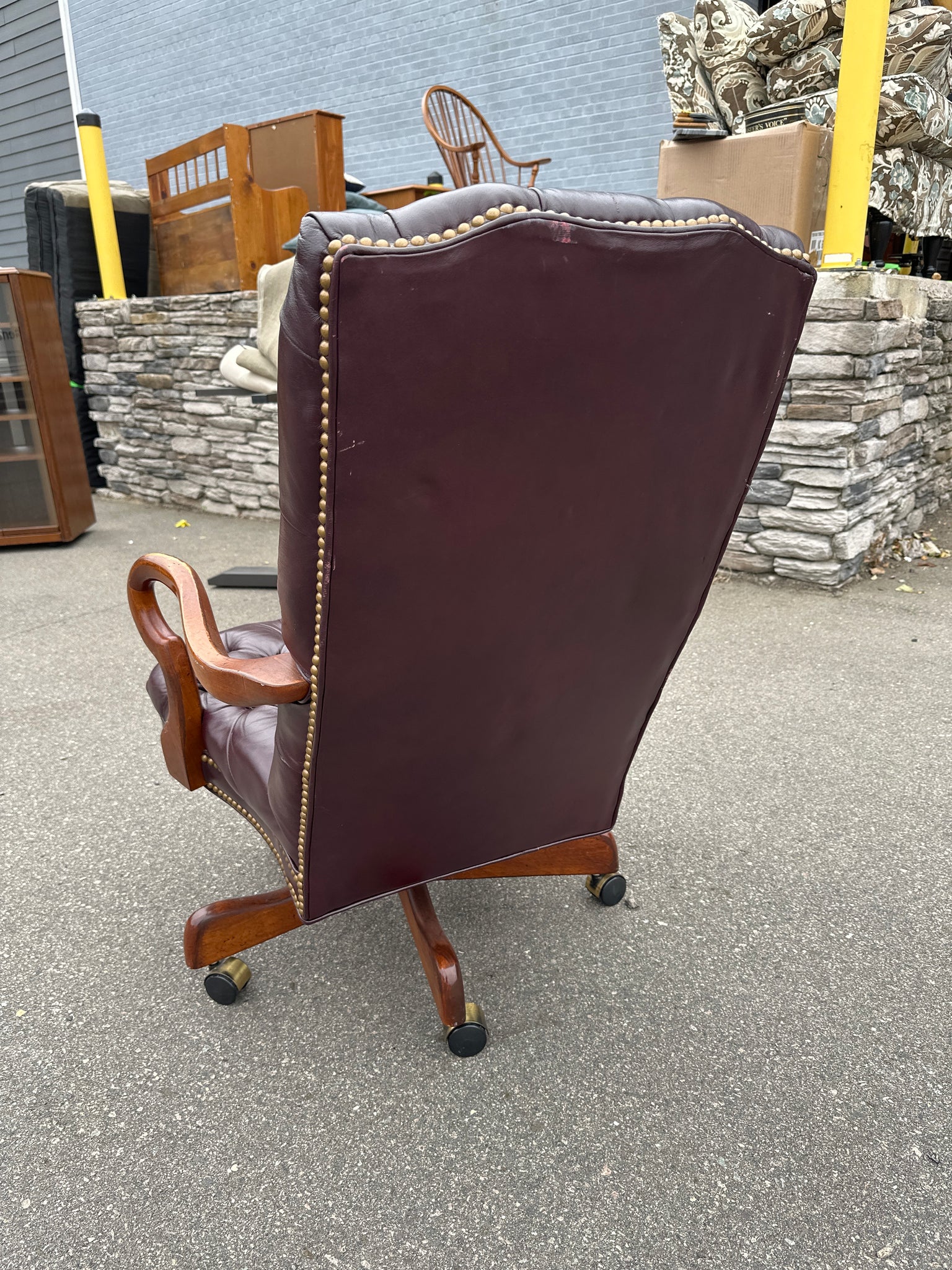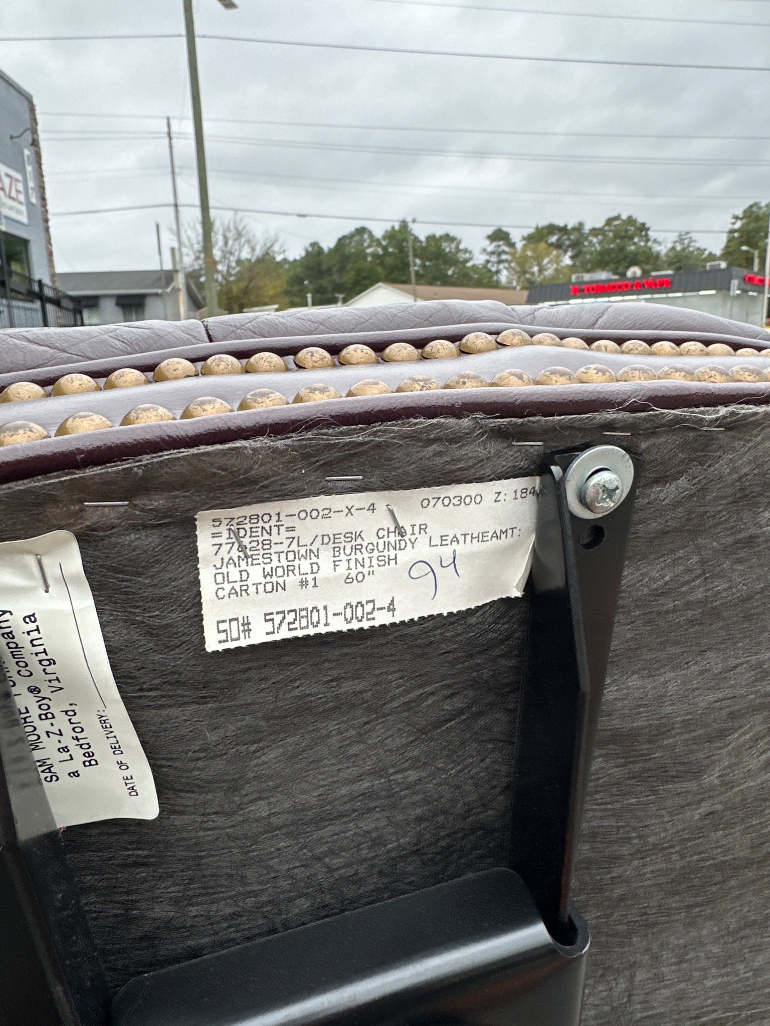 Built by La-Z-Boy in Bedford, Virginia, this chair showcases premium leather upholstery in the classic “Jamestown Burgundy” tone. The supple leather features hand-tufted detailing, accented by antique brass nailhead trim. The sculpted solid wood arms and base, finished in a warm Old World tone, enhance its stately presence. Smooth-rolling casters and a sturdy swivel base complete this masterfully constructed piece.