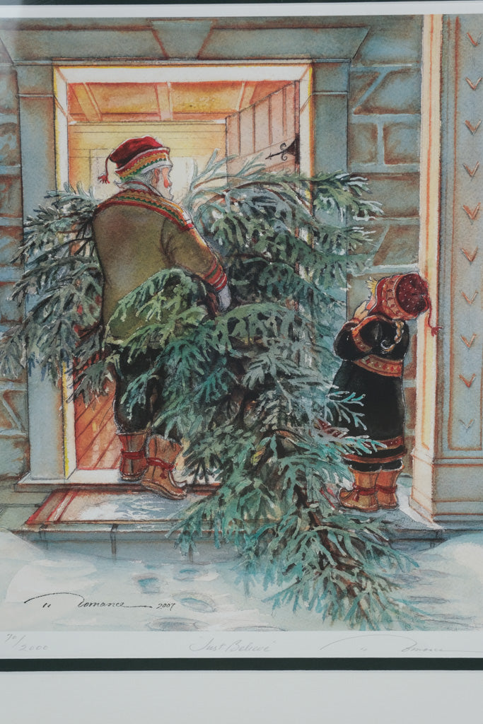 Bring home the timeless warmth of the holiday season with “Just Believe” by beloved Canadian artist Trisha Romance. This limited edition print, numbered 70/2000, beautifully captures a nostalgic winter scene — a father carrying a freshly cut Christmas tree through the snow as a child eagerly awaits by the door. Romance’s signature watercolor style, rich in emotion and soft detail, evokes the heart of family traditions and the quiet magic of Christmastime.