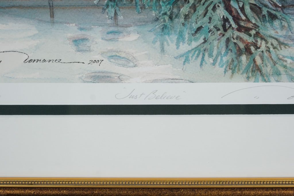 Expertly double-matted in white and hunter green and showcased in an elegant gold-tone frame, this piece is both collectible and display-ready. Signed and dated by Trisha Romance (2007), Just Believe makes a treasured addition for collectors and a heartwarming accent for any home.