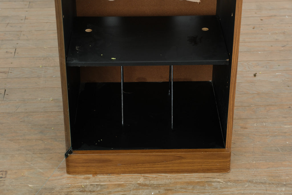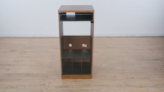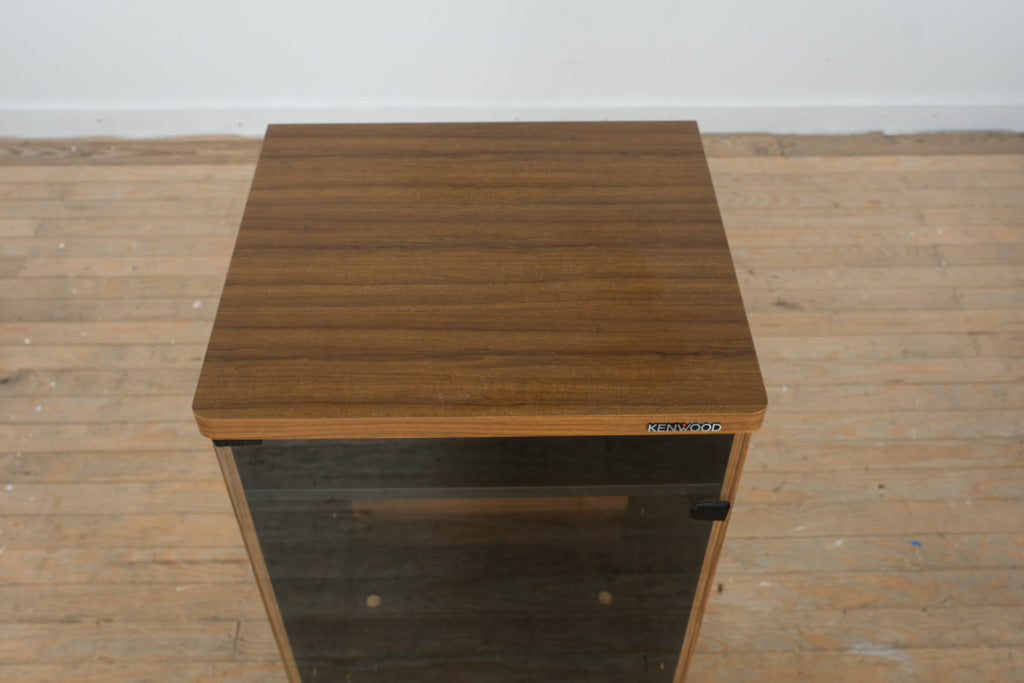 A sleek vintage Kenwood stereo cabinet designed for both function and timeless appeal. Featuring clean lines, warm woodgrain laminate, and a smoked glass front door, this piece captures the understated elegance of mid-century audio furniture — perfect for showcasing and protecting your hi-fi equipment or media collection.