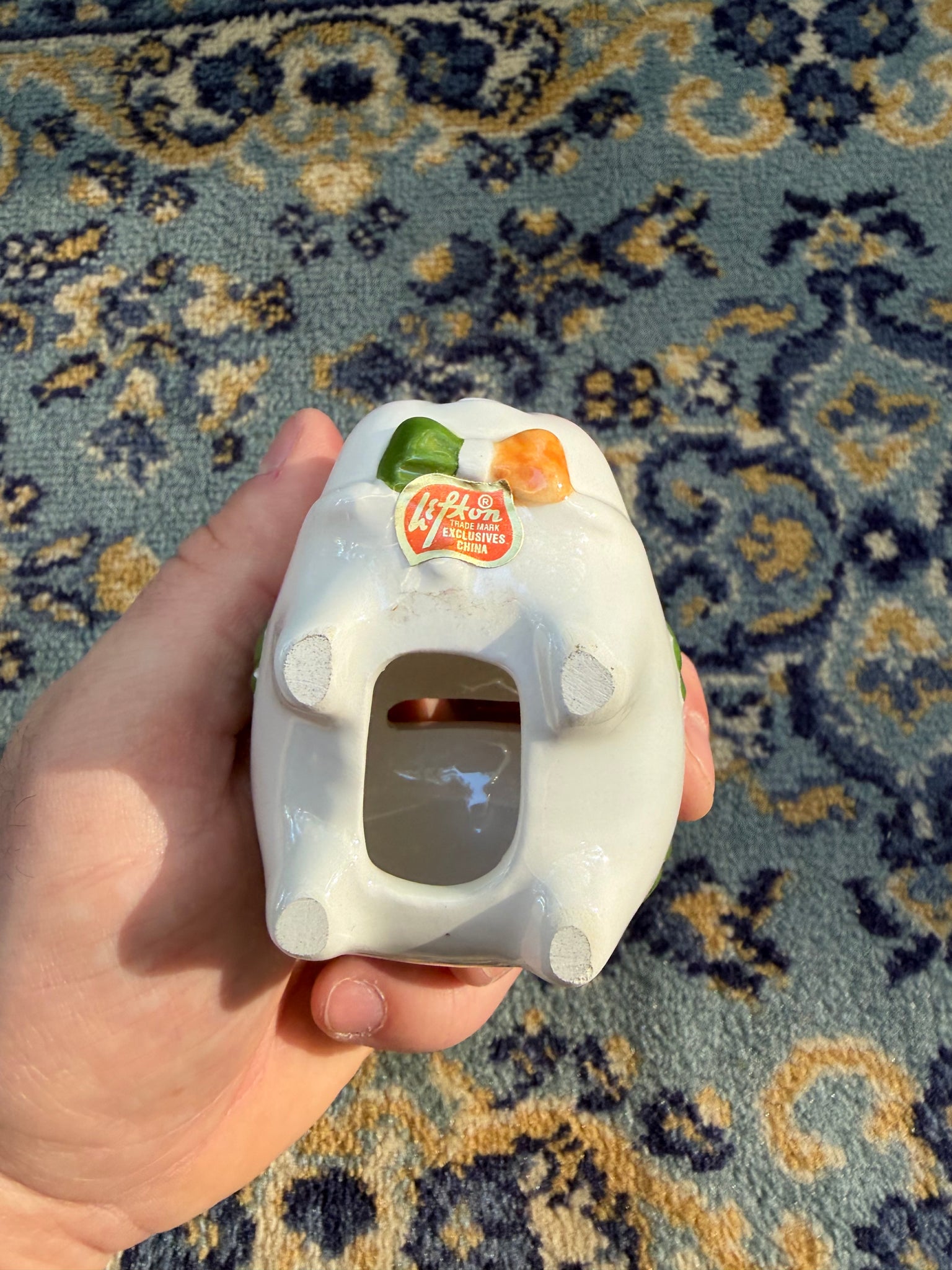 Add a bit of Irish charm to your home with this vintage Lifton ceramic piggy bank, featuring a smiling pig dressed for St. Patrick’s Day in a jaunty green hat and shamrock accents. Its cheerful design and hand-painted details make it both a delightful collectible and a functional coin bank. Compact in size but rich in personality, this little pig is perfect for collectors of retro ceramics, Irish décor, or whimsical vintage finds.