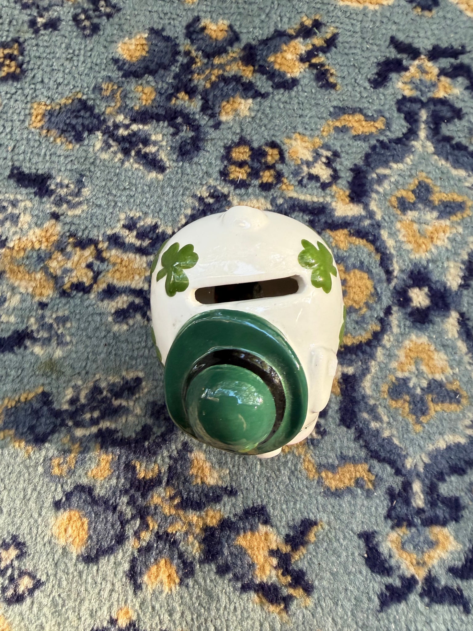 Design: White pig with green hat, hand-painted four-leaf clovers, coin slot on back, open base (missing stopper)