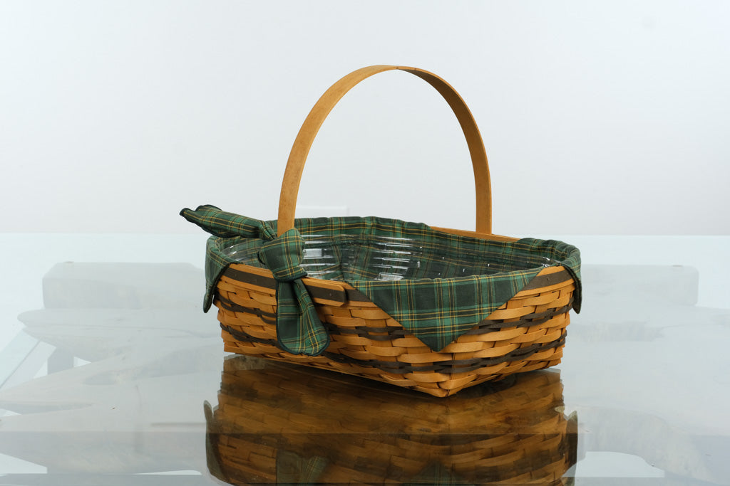 Made with Longaberger’s signature hardwood maple splints and finished in a warm honey stain, this collectible basket includes its original green plaid fabric liner, plastic protector, and product booklet, all in excellent condition. The basket’s oval form with a sturdy swing handle makes it perfect for both display and everyday use.