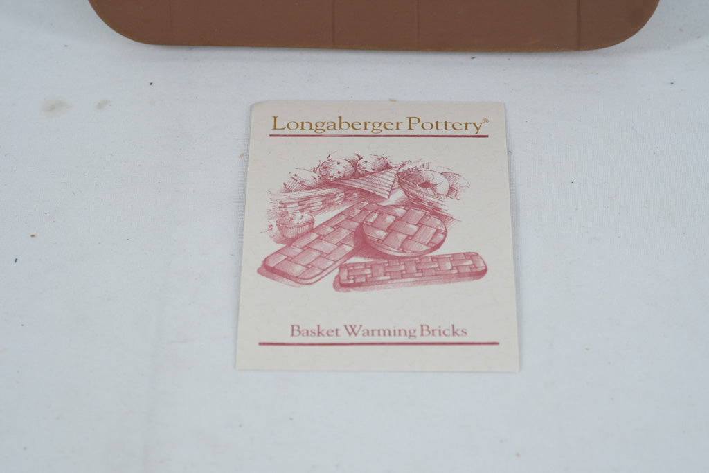 This example is new, unused, and comes in its original box with the Longaberger Basket Warming Bricks instruction card. The buffet brick features the classic woven design pattern and is marked as Dishwasher, Oven, and Freezer Safe.