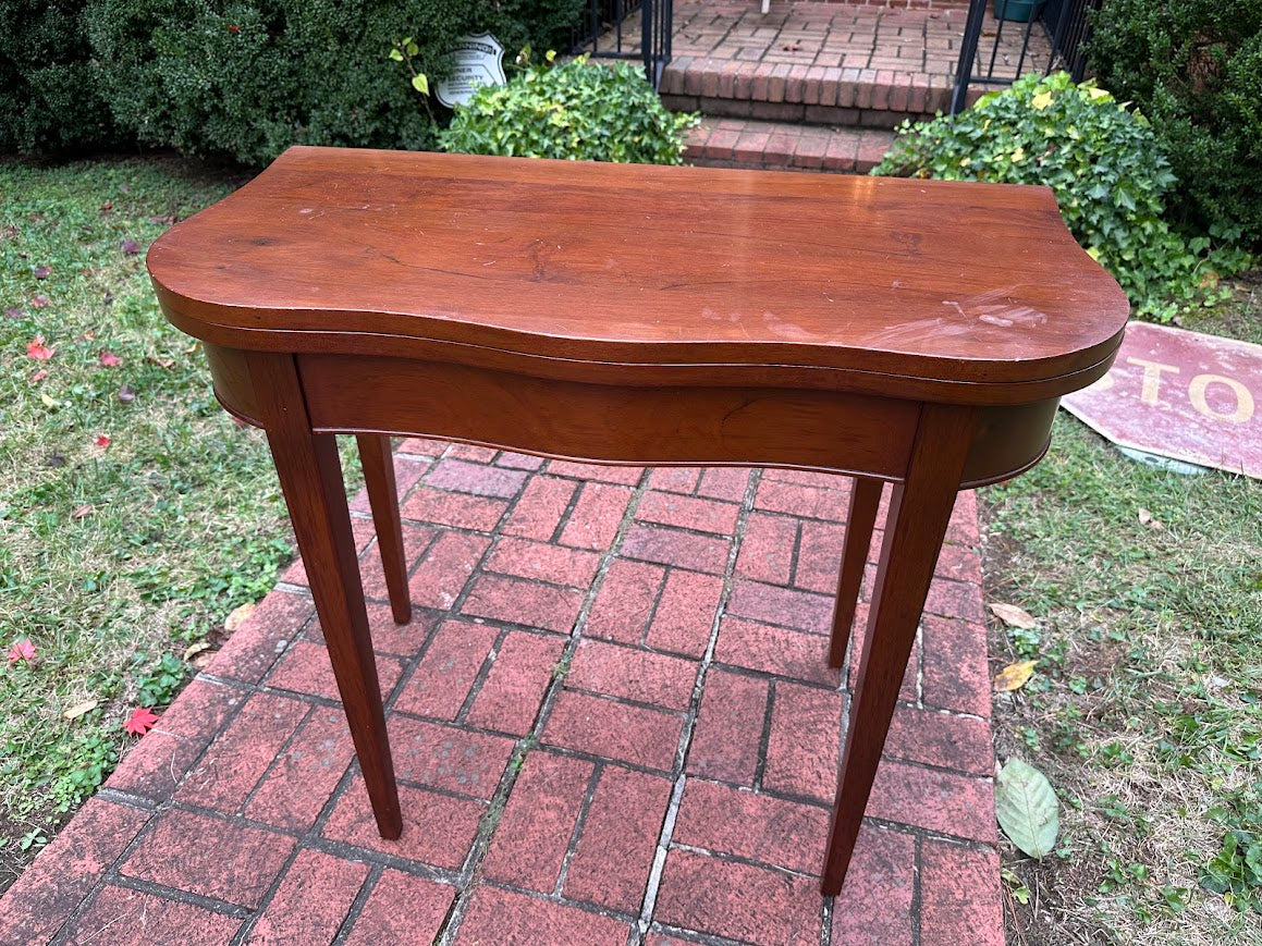 Gracefully merging function and timeless elegance, this mahogany folding game table embodies the craftsmanship and warmth of fine traditional furniture. With its softly curved edges, tapered legs, and rich hand-rubbed finish, this piece brings a refined presence to any space while offering the practicality of a convertible design.