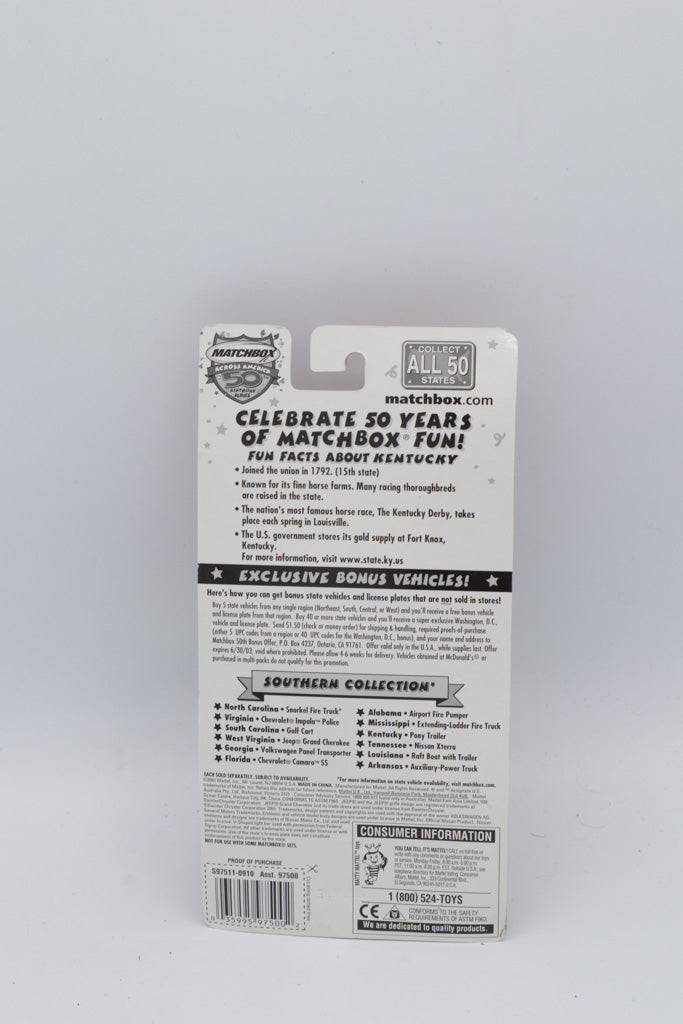 Celebrate the Bluegrass State with this Matchbox Across America 50th Birthday Series collectible from 2002! This die-cast Pony Trailer pays tribute to Kentucky’s equestrian heritage, featuring detailed horse graphics and a bright blue finish. The included decorative “KY 015” license plate marks Kentucky as the 15th state in the Union.