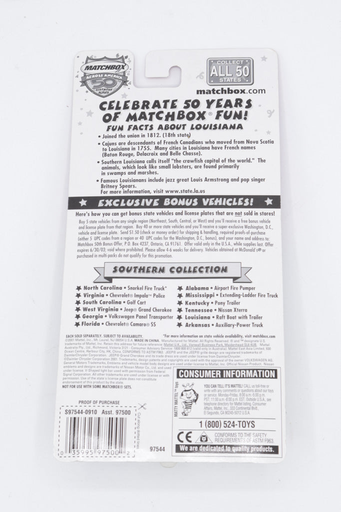 Celebrate 50 years of Matchbox® fun with this collectible Across America 50th Birthday Series Louisiana Raft Boat! Featuring the “LA 018 – Sportsman’s Paradise” state plate, this bright yellow raft boat with trailer captures the Cajun spirit and outdoor adventure of Louisiana’s bayous.
