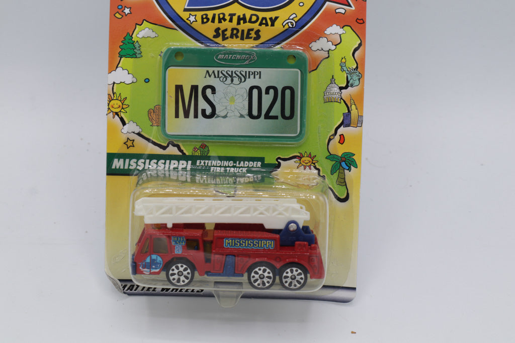 Celebrate the Magnolia State with this Matchbox Across America 50th Birthday Series collectible, released in 2002 to honor 50 years of Matchbox excellence! This die-cast Extending-Ladder Fire Truck represents Mississippi, featuring bright red paint, blue state markings, and a functional white ladder. The included “MS 020” decorative license plate marks Mississippi as the 20th state to join the Union.