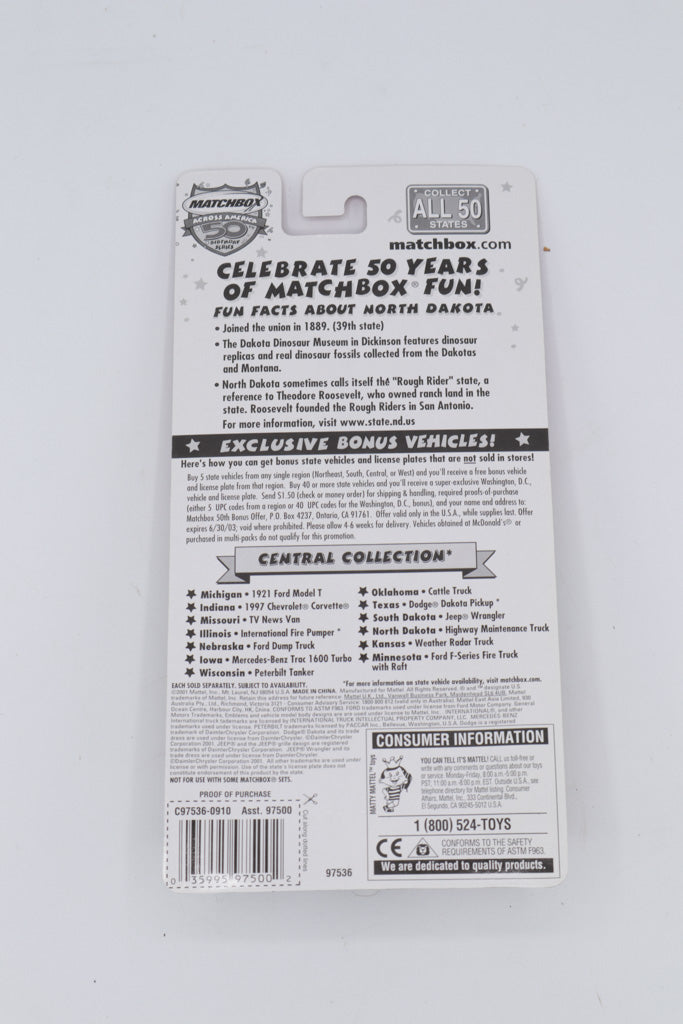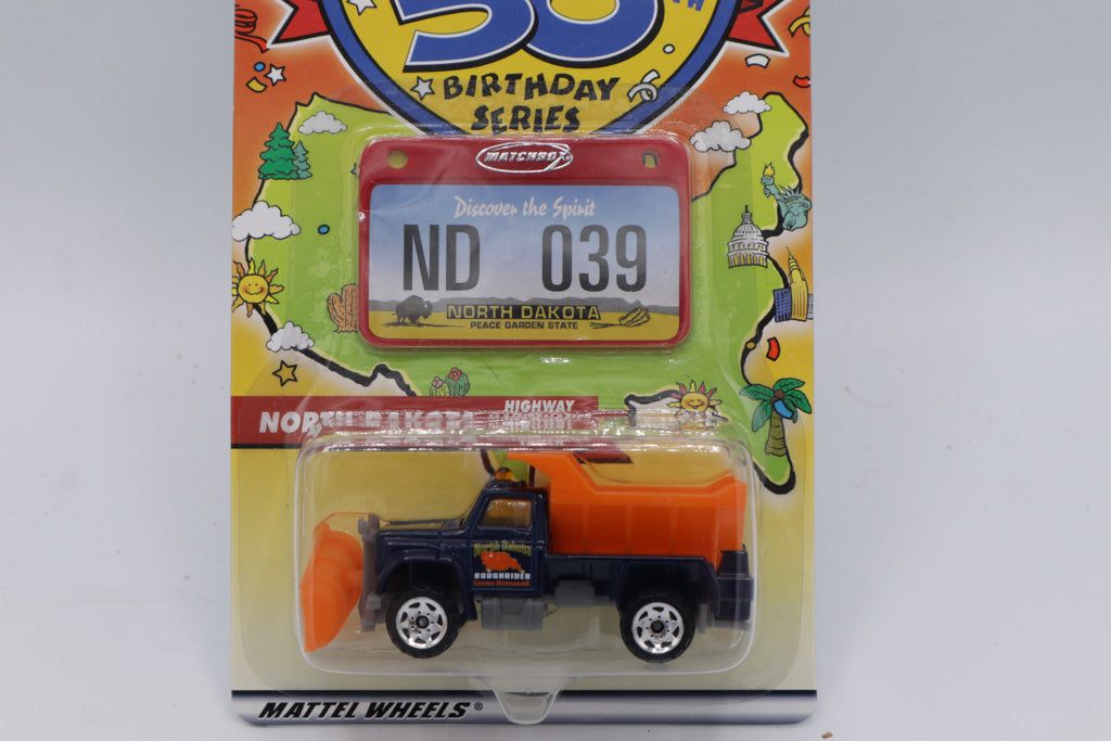 Commemorate the Peace Garden State with this Matchbox Across America 50th Birthday Series collectible, celebrating 50 years of Matchbox craftsmanship! This die-cast Ford Dump Truck showcases a “North Dakota Highway Maintenance” theme, complete with an orange plow and dump bed—symbolizing the state’s rugged winters and hardworking roads. The included decorative license plate, “ND 039,” represents North Dakota’s proud place as the 39th state in the union.
