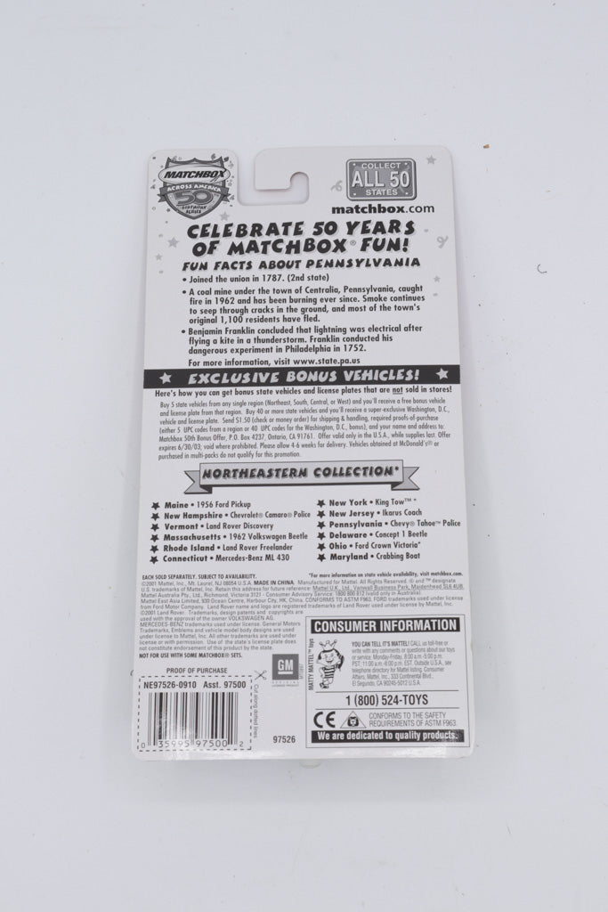 Celebrate Matchbox’s 50th Anniversary with this Across America 50th Birthday Series collectible honoring the state of Pennsylvania! This die-cast Chevy Tahoe Police features a bold “Pennsylvania Electric” rescue theme with lightning bolt graphics—an homage to the state’s connection to Benjamin Franklin’s famous lightning experiment. The matching “PA 002” decorative license plate ties it perfectly to the second state in the union.