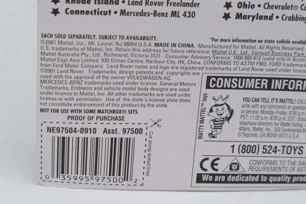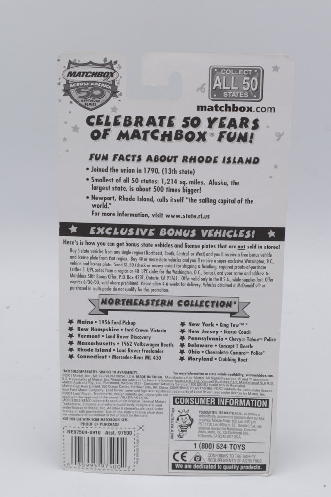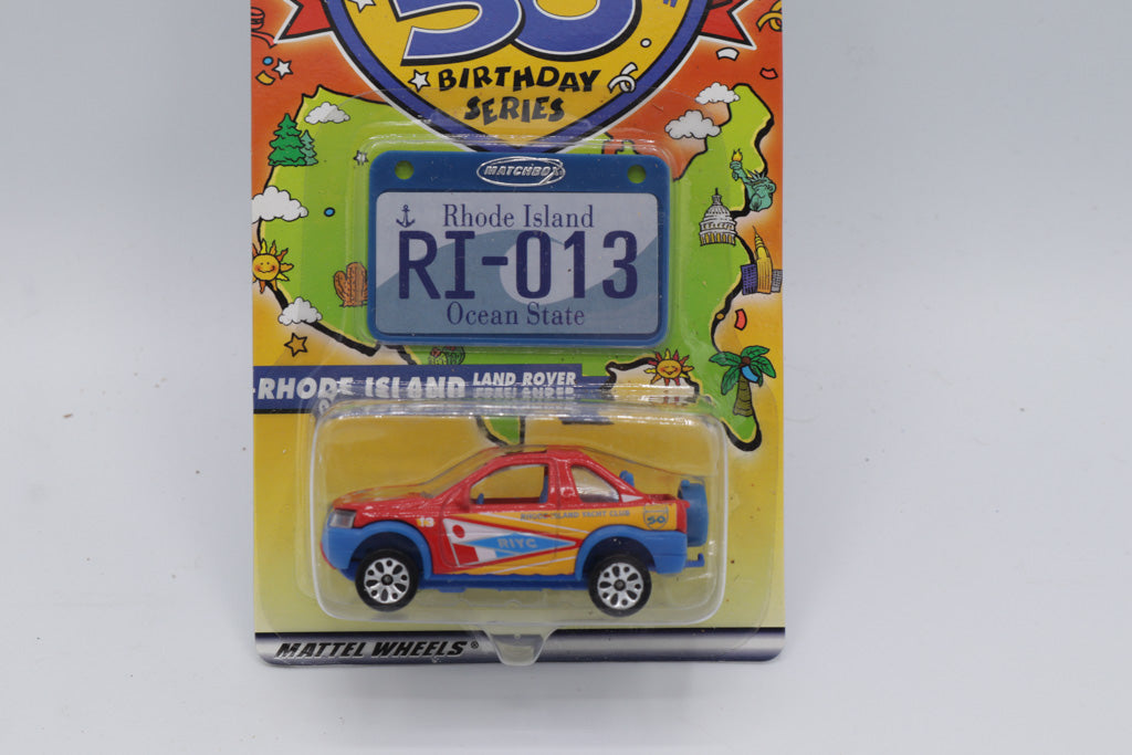 Celebrate the Ocean State with this Matchbox Across America 50th Birthday Series collectible from 2002! Featuring the bold and sporty Land Rover Freelander, this die-cast vehicle captures Rhode Island’s coastal charm with its red and blue “R.I.Y.C. – Rhode Island Yacht Club” graphics and nautical flair. The included “RI 013” decorative license plate commemorates Rhode Island as the 13th state to join the Union.