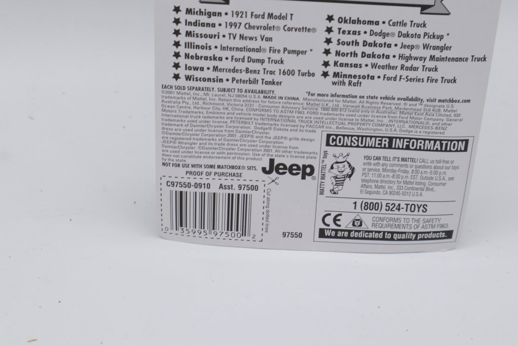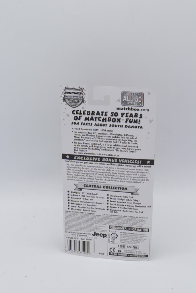Celebrate the Mount Rushmore State with this Matchbox Across America 50th Birthday Series collectible from 2002! This die-cast Jeep Wrangler pays tribute to South Dakota’s rugged beauty and historic landmarks, featuring “Mount Rushmore Adventure Tours” graphics and a rich green finish. The included “SD 040” decorative license plate marks South Dakota as the 40th state in the Union.