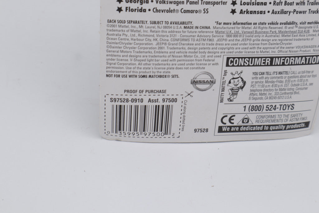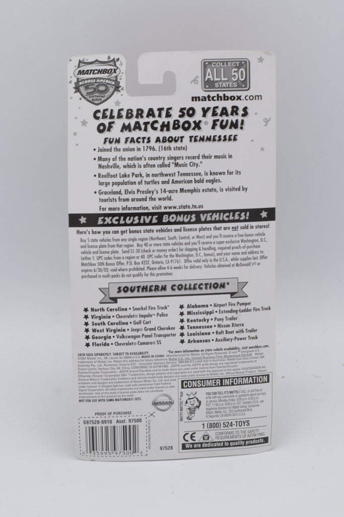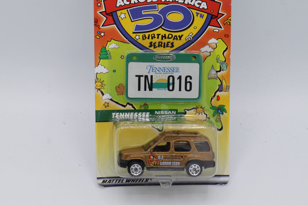 Celebrate The Volunteer State with this Matchbox Across America 50th Birthday Series collectible from 2002! This die-cast Nissan Xterra honors Tennessee’s musical and outdoor heritage, featuring brown metallic paint and “16.0 Tennessee Adventure Tours” graphics. The included “TN 016” decorative license plate marks Tennessee as the 16th state in the Union.