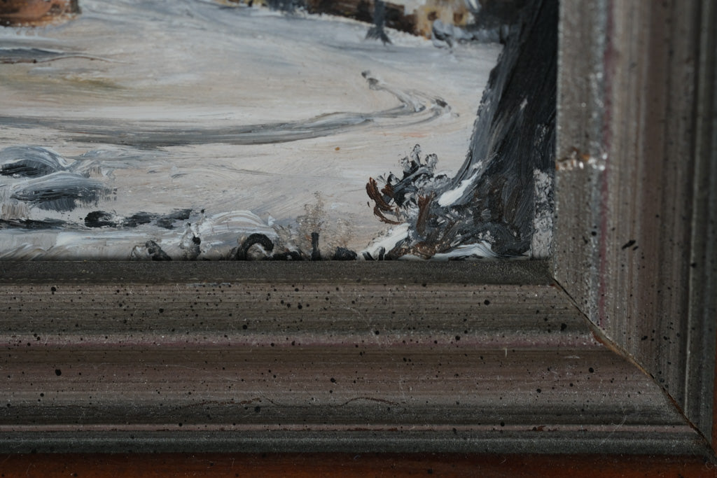 This charming oil on canvas captures a nostalgic winter scene with a snowy homestead, rustic mill, and horse-drawn sleigh—painted in thick, expressive strokes. Rich with mood and movement, it’s signed Coley in the lower corner and presented in a layered wood and silver-toned frame that enhances its vintage charm.