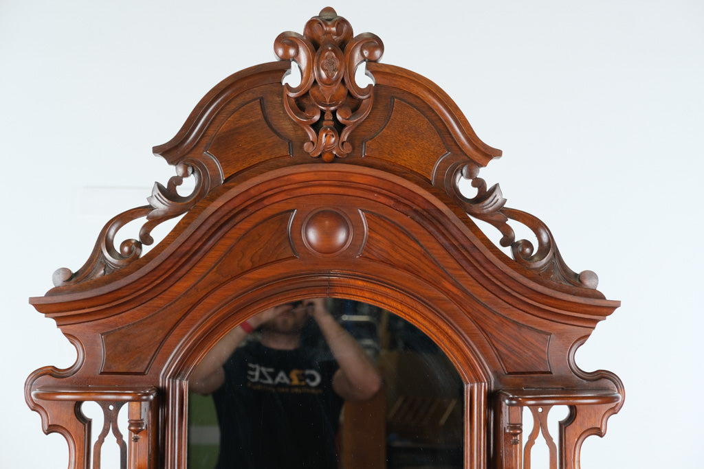 This monumental Eastlake étagère is a breathtaking showcase piece, crafted to impress and designed to display your most treasured collections. Standing an impressive 84” tall, this head-turning cabinet features a dramatic arched crown with carved scrollwork, a large beveled mirror, and intricate open fretwork sides that embody the elegance of Eastlake design.