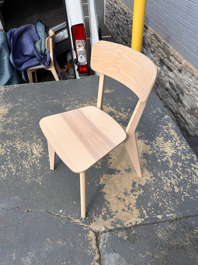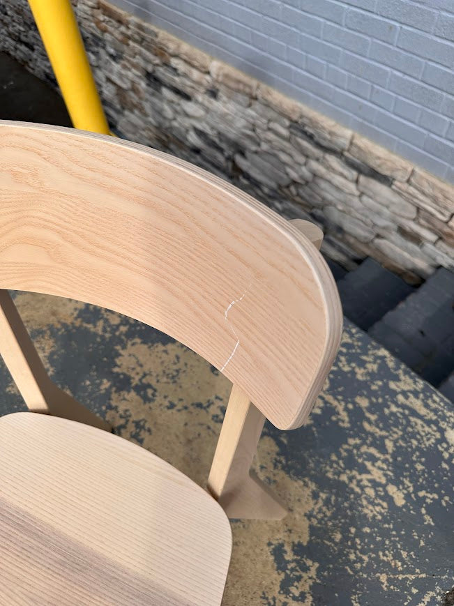 Crafted from solid ash and ash veneer, this chair showcases the natural wood grain unique to each piece. Its sturdy frame and gently curved backrest provide lasting comfort and support, while the durable, hand-brushed lacquer finish highlights the pale natural tone of the wood. Designed for both everyday function and timeless visual appeal.
