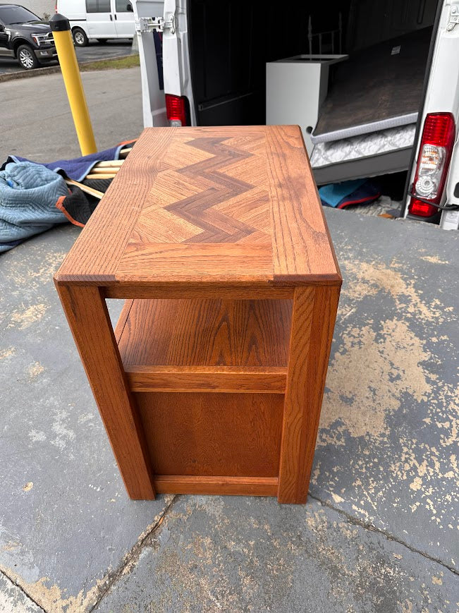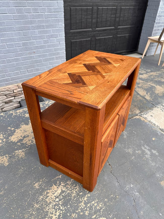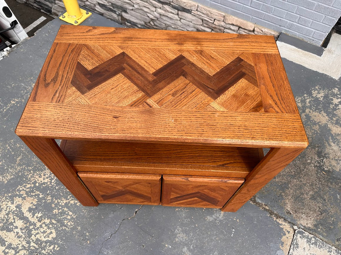 Perfect as an entryway console, media stand, or bedside piece, this oak cabinet adds warmth and visual texture through its striking chevron design. Its scale suits both modern and vintage-inspired interiors, offering a functional surface for décor display and hidden storage for everyday essentials. A statement piece that bridges utility and artistry in one refined form.