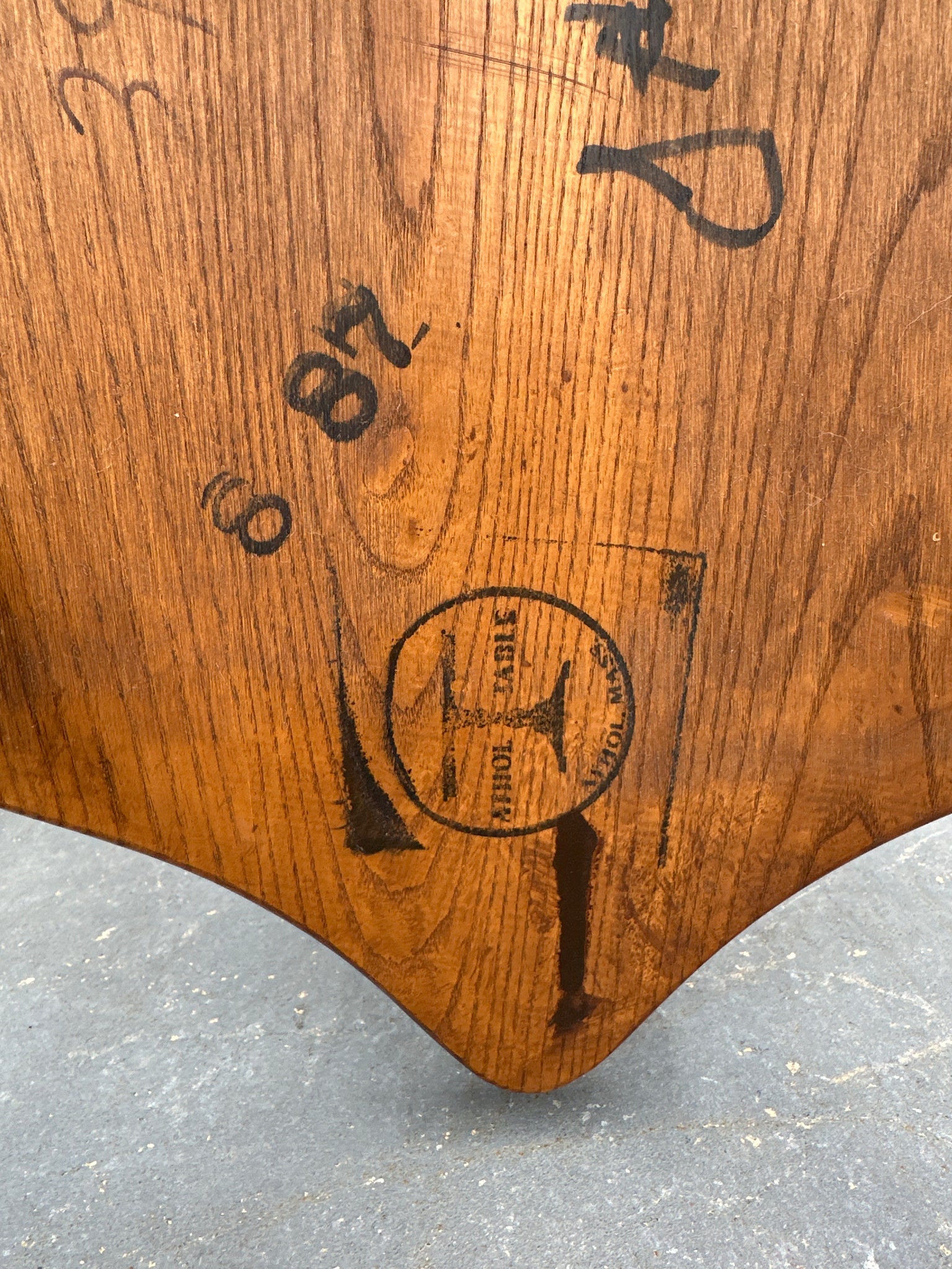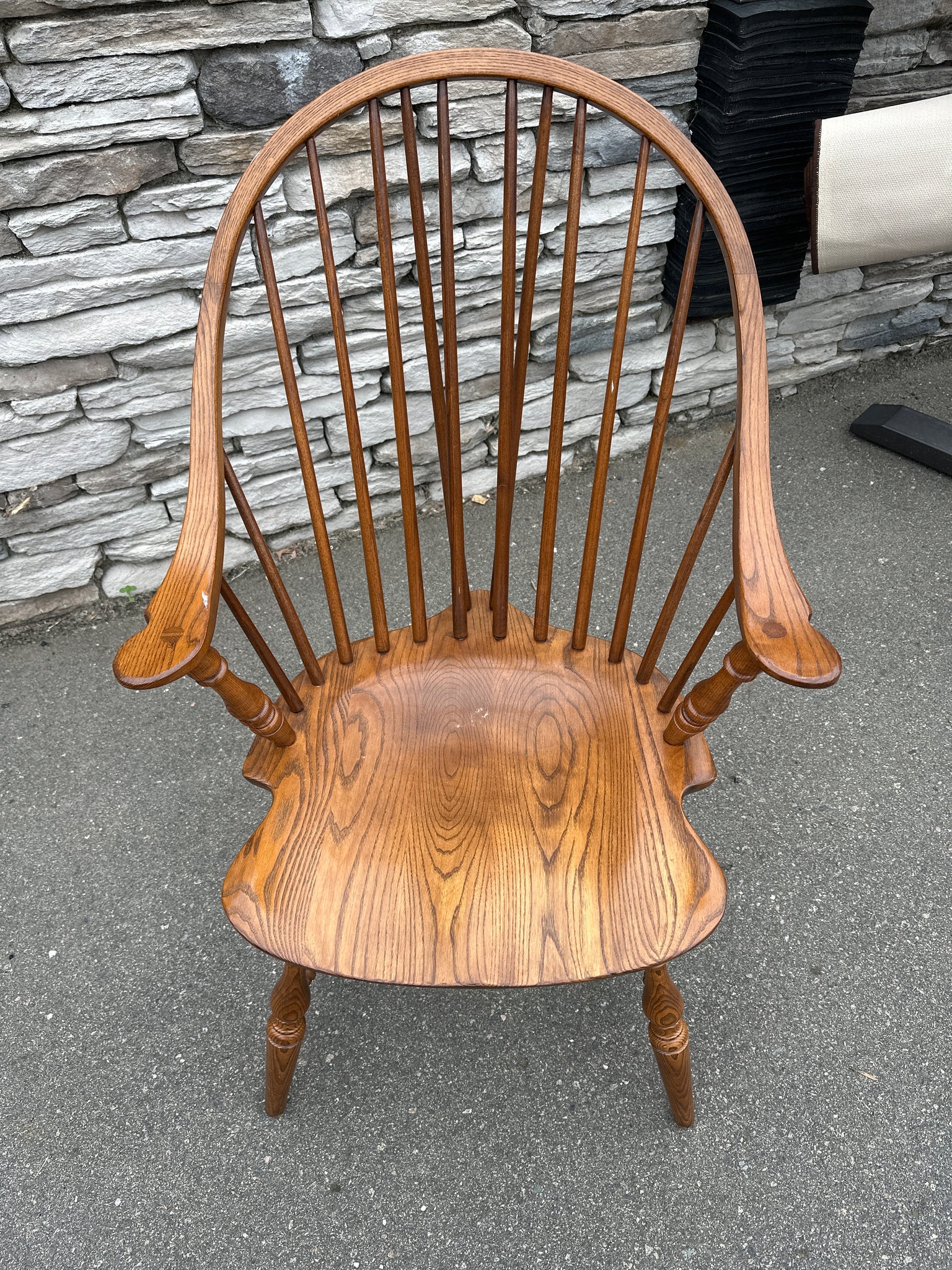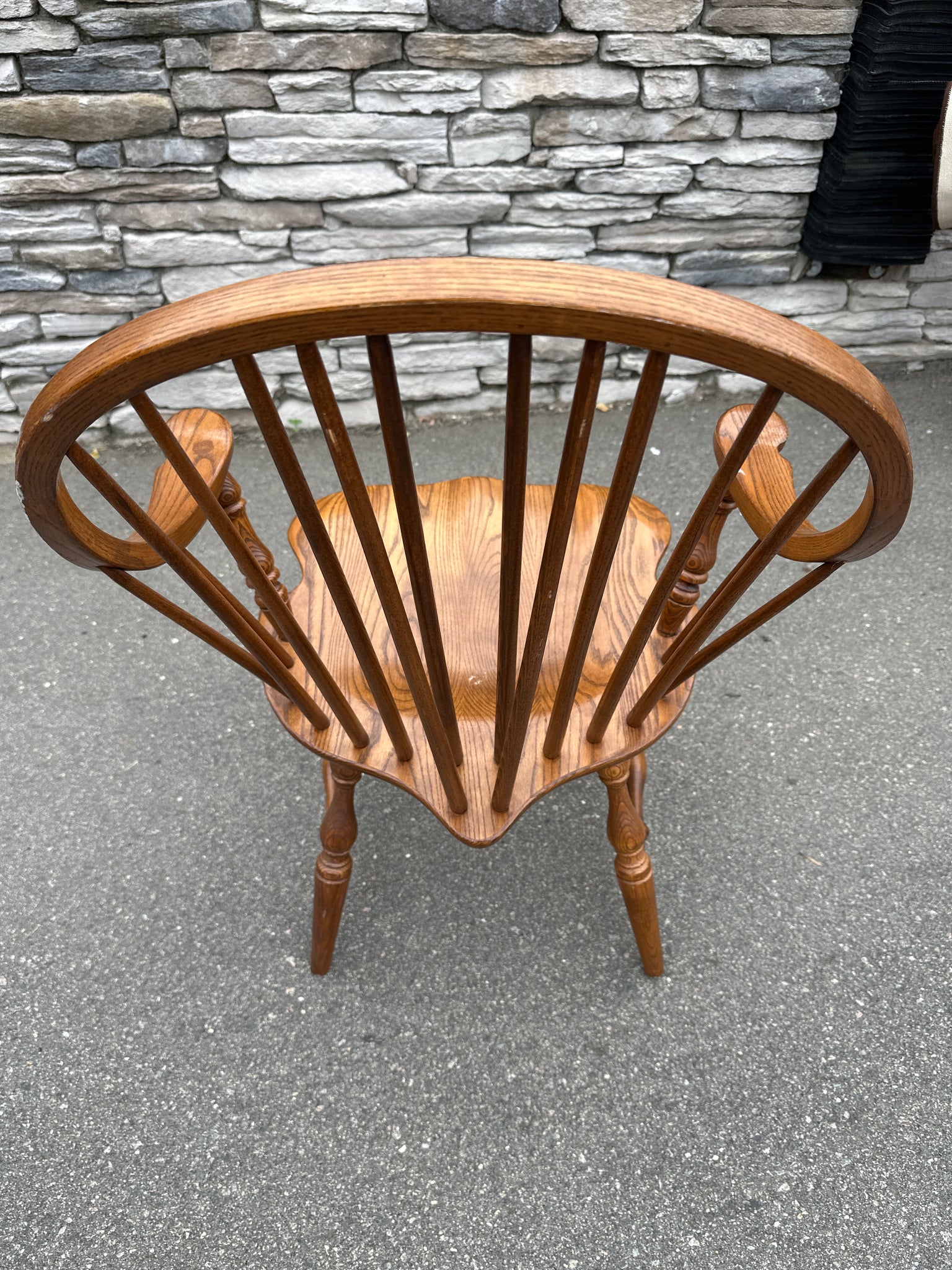 Crafted in solid oak, this chair exemplifies traditional Windsor design: a contoured saddle seat, smoothly turned legs, and a high, arched spindle back and arms. The warm finish highlights the oak’s grain and complements the chair’s refined silhouette. A subtle maker’s mark (Athol Table Co.) is visible on the underside, confirming its origin.