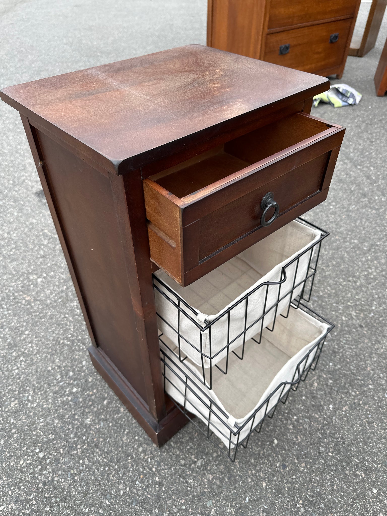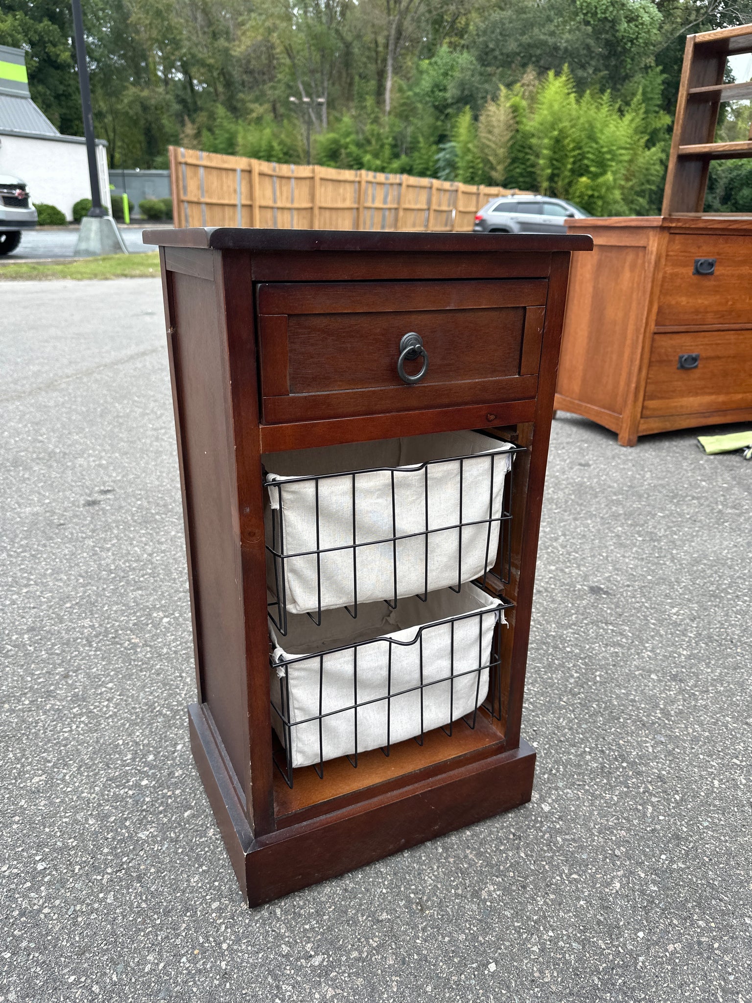 Crafted from solid wood and wood veneer with a deep brown finish, this cabinet features a single top drawer accented by a round metal pull. Below are two removable wire-frame drawers with fabric liners — perfect for keeping everyday essentials neatly contained. Its sturdy construction and thoughtful proportions make it both attractive and reliable.