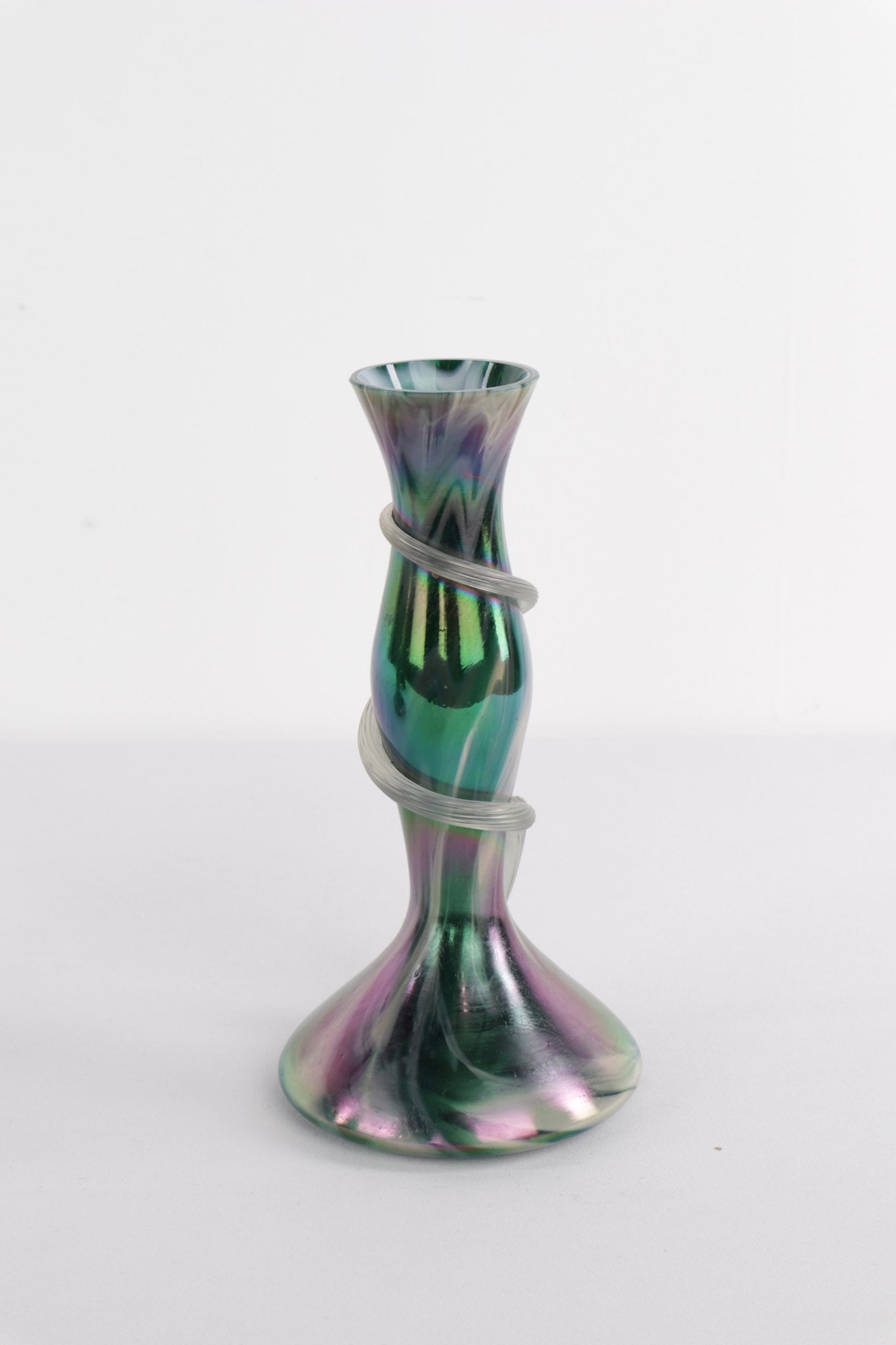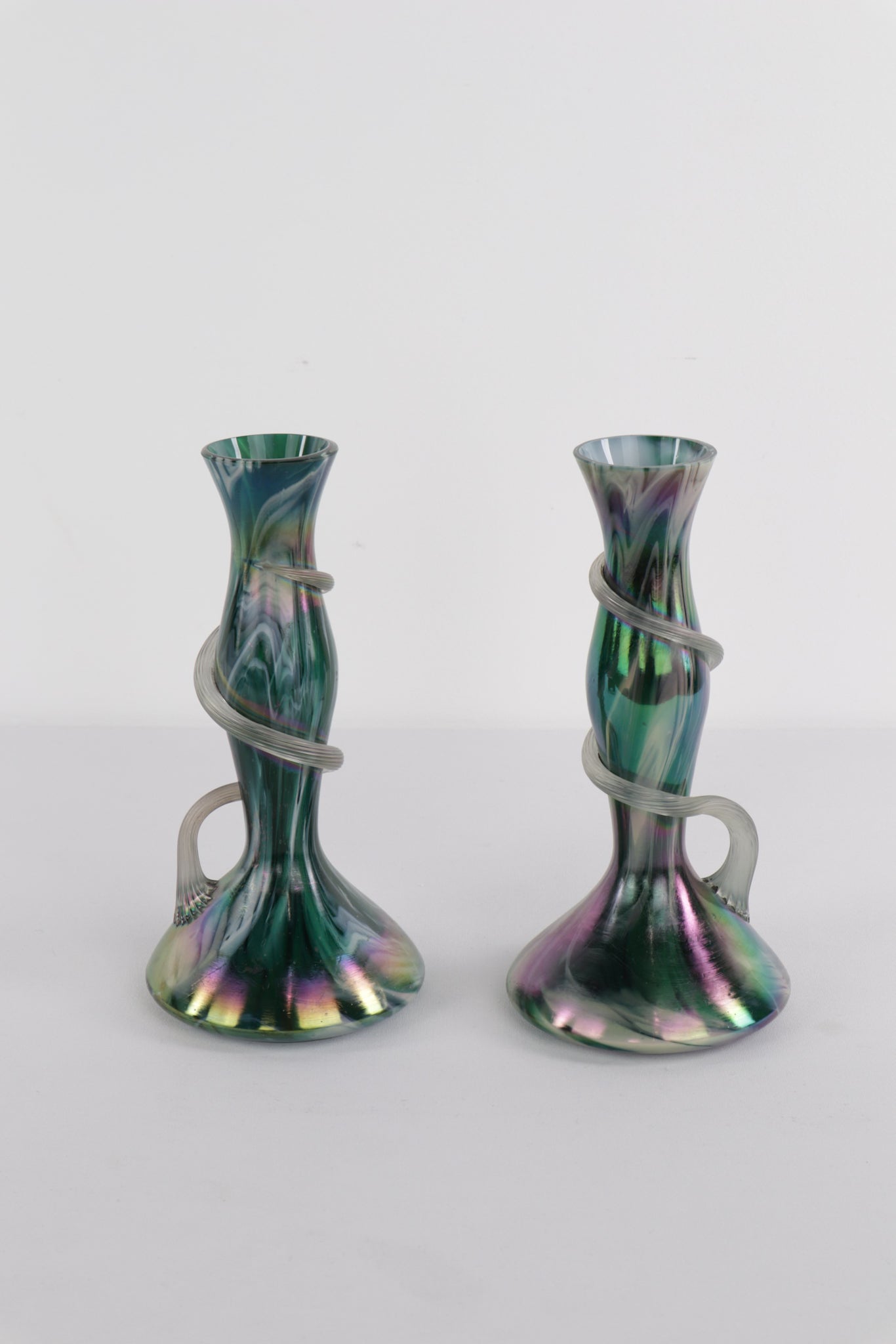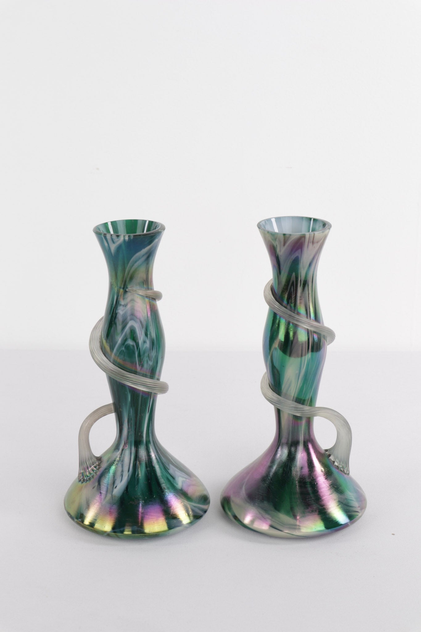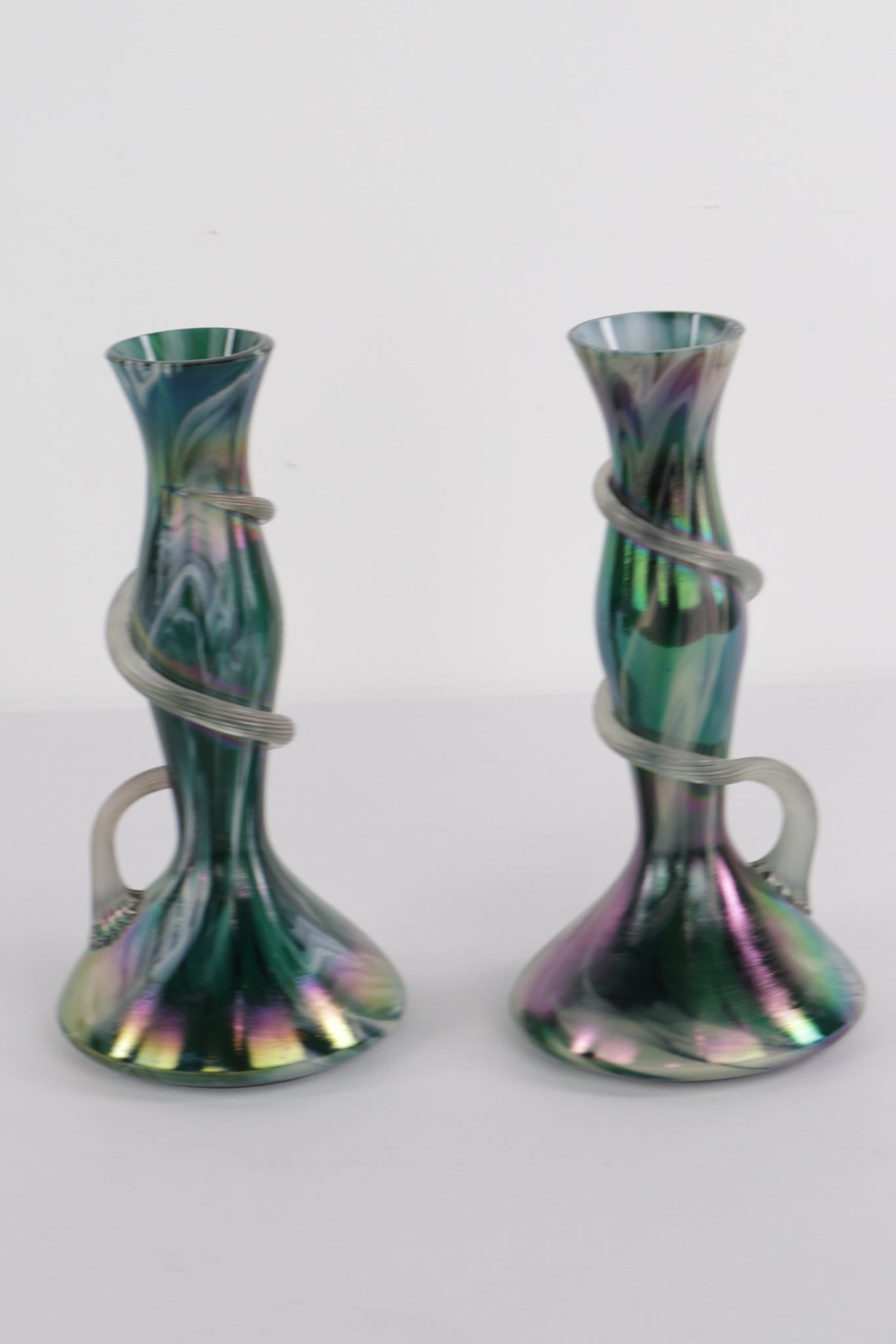 This striking pair of handblown art glass vases features a shimmering iridescent swirl design in green and purple tones, accented with an applied clear glass coil that spirals gracefully around each vase. A matched set, they make an elegant statement for display, collection, or as a decorative centerpiece.