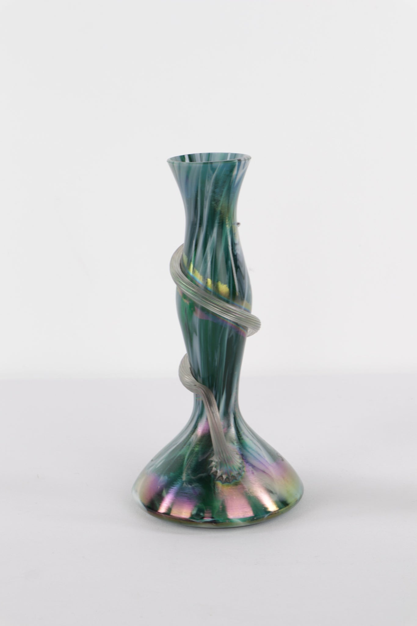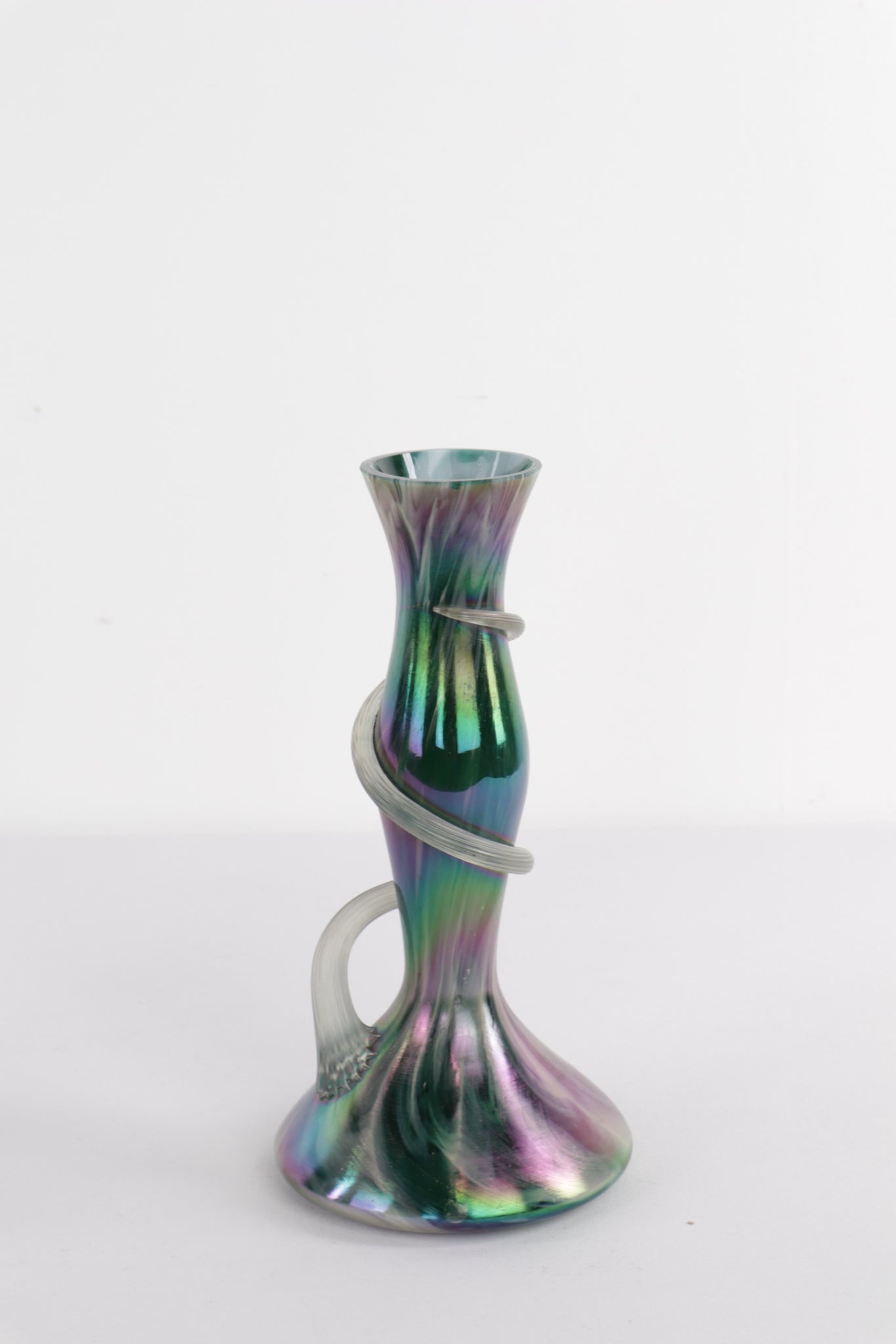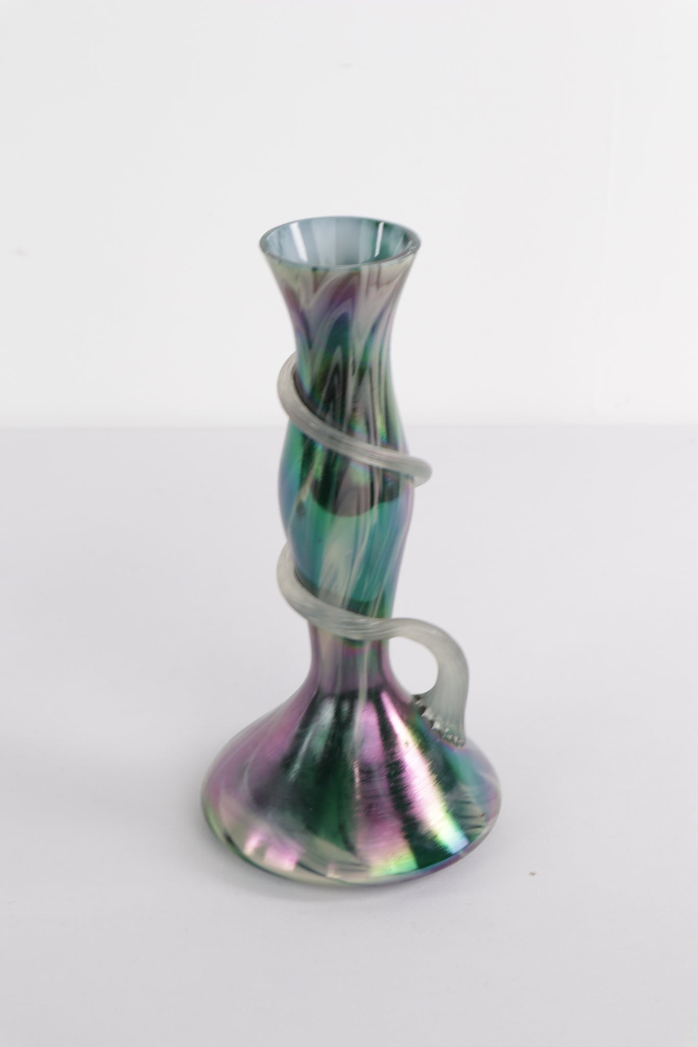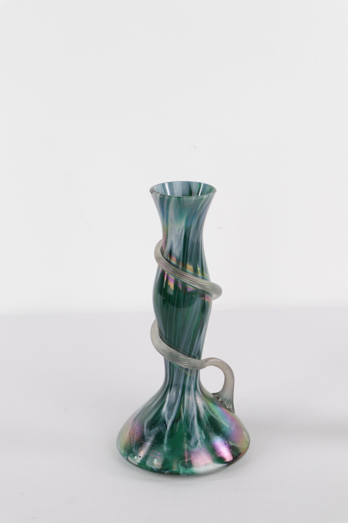 This striking pair of handblown art glass vases features a shimmering iridescent swirl design in green and purple tones, accented with an applied clear glass coil that spirals gracefully around each vase. A matched set, they make an elegant statement for display, collection, or as a decorative centerpiece.