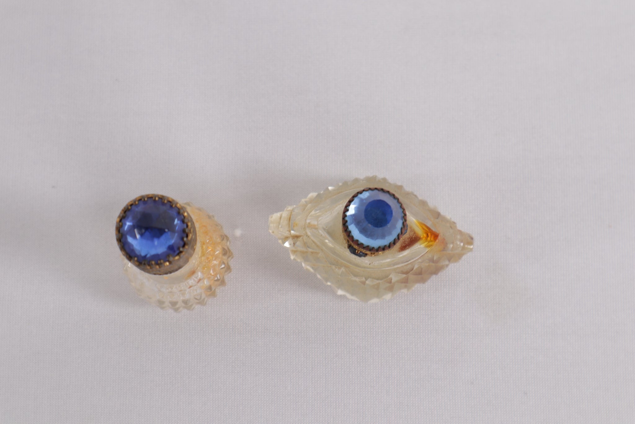 • Load image into Gallery viewer, Pair of Vintage Cut Glass Perfume Bottles with Ornate Jeweled Blue Stoppers – Vanity Collectible