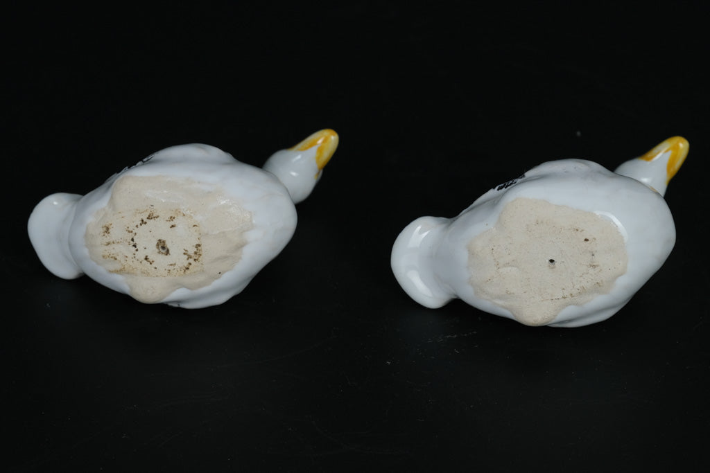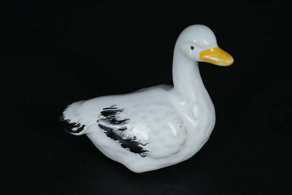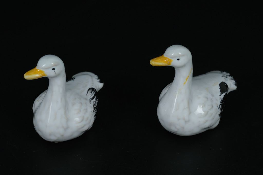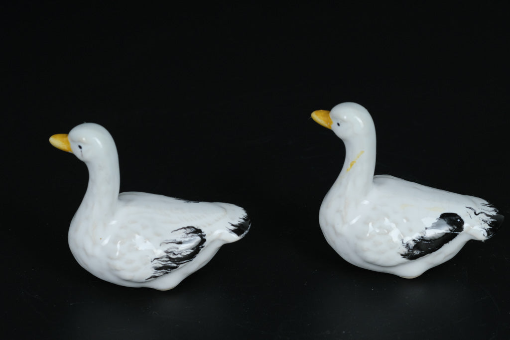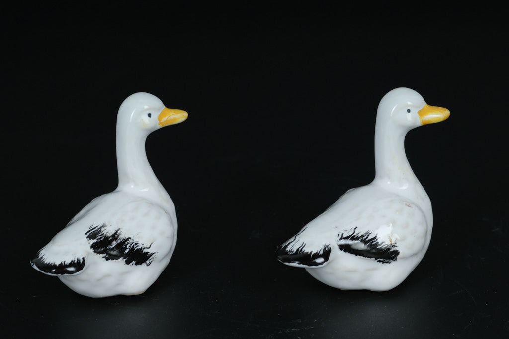 Add a touch of pastoral charm to your decor with this pair of vintage porcelain goose figurines, hand-painted in soft white with black and yellow accents. Each bird features delicate feather detailing and expressive eyes, making them a whimsical addition to a shelf, mantel, or table centerpiece. Likely mid-century Japanese imports, these geese were molded in ceramic and finished with a smooth high-gloss glaze.