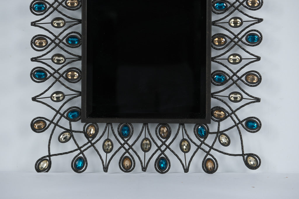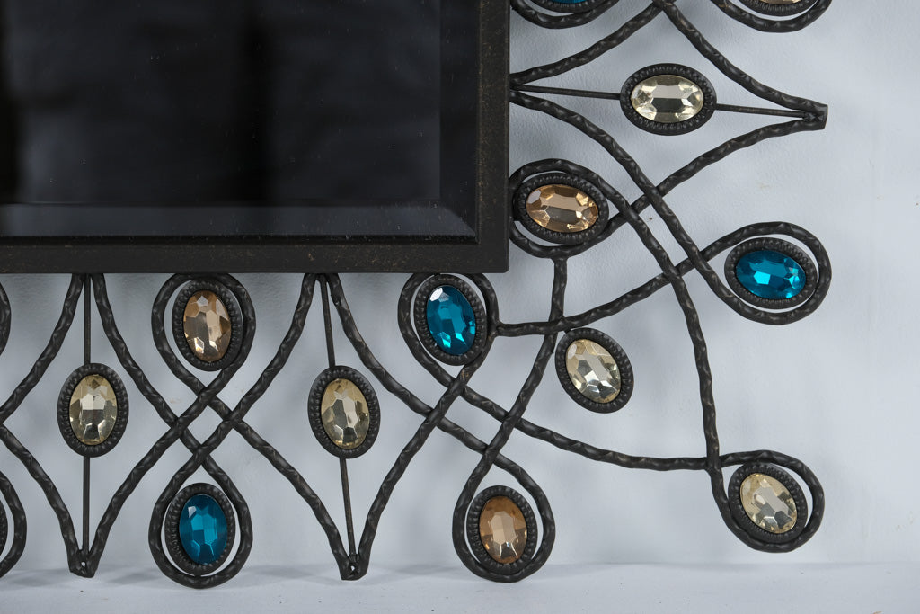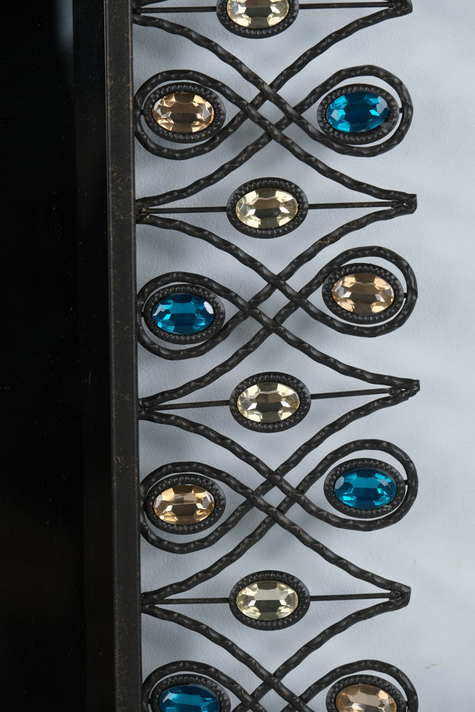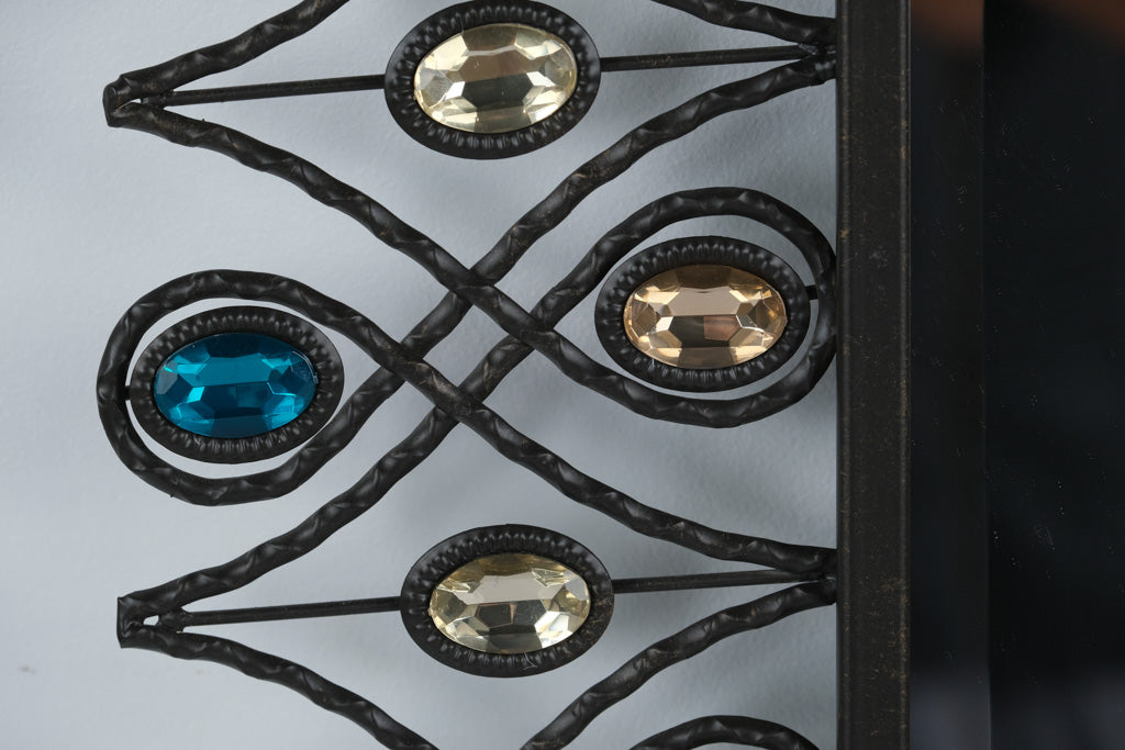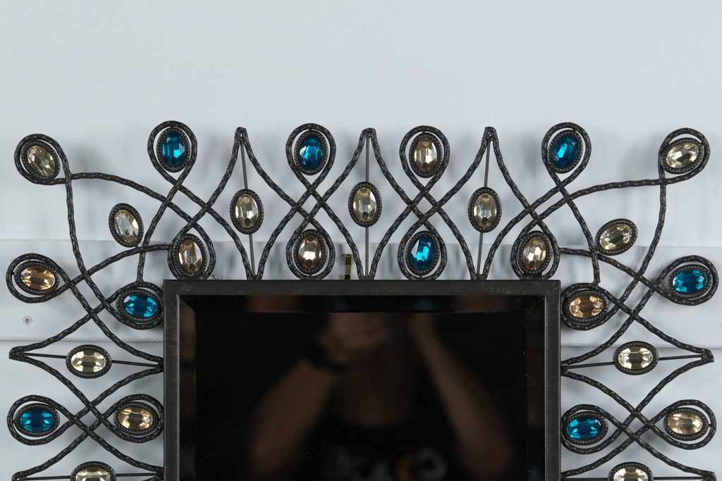 Add a touch of glam and artistry to your home with this stunning “Stardust Peacock” Mirror from Pier 1 Imports. Featuring a sculptural wrought-metal frame with flowing, feather-like curves, each accented by faceted glass jewels in shimmering sapphire blue, champagne, and amber tones, this mirror evokes the elegance of a peacock’s plumage. The mirror’s tall, rectangular profile makes it a perfect statement piece for an entryway, bedroom, or living room—balancing bohemian charm with sophisticated sparkle.