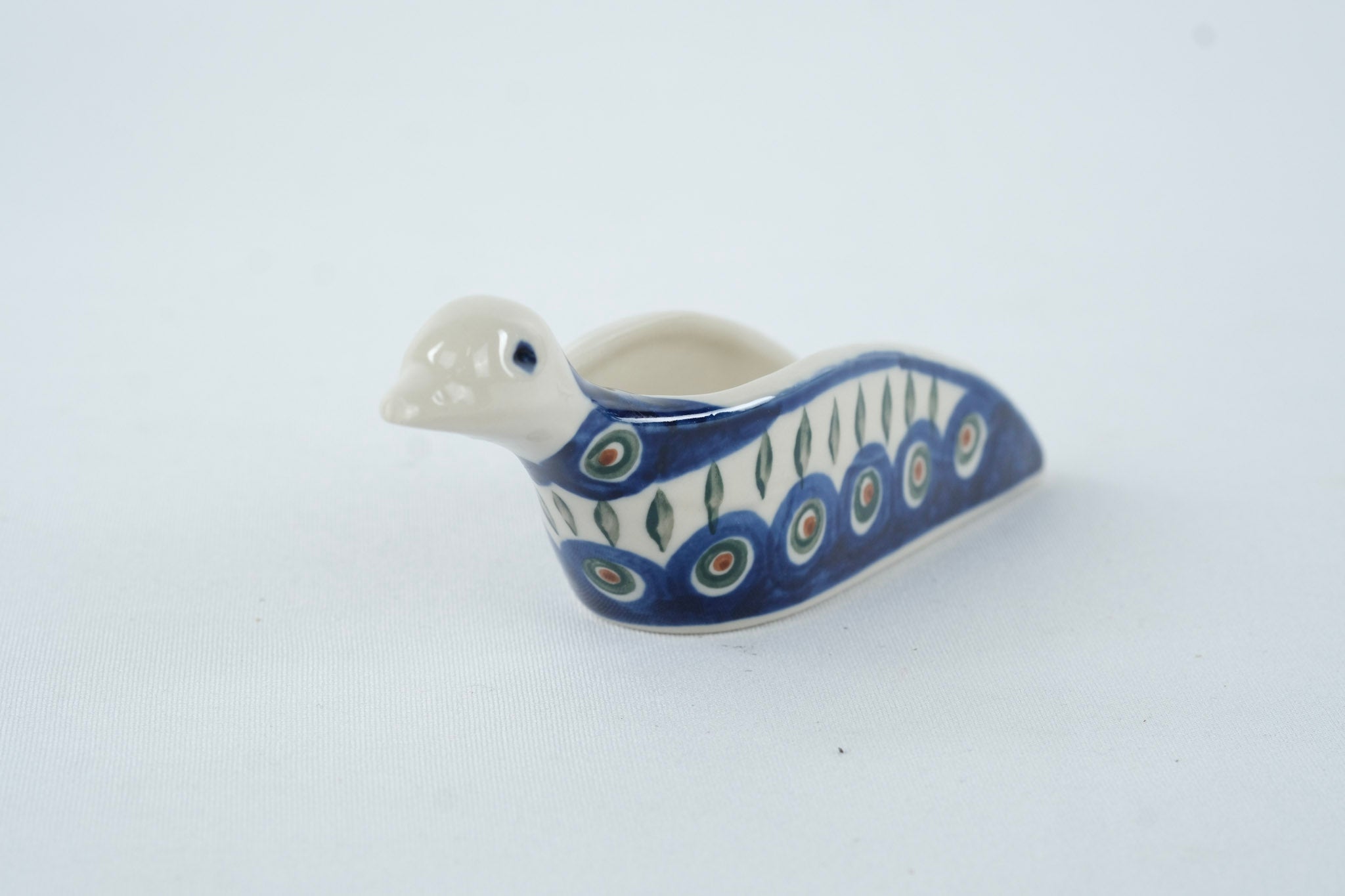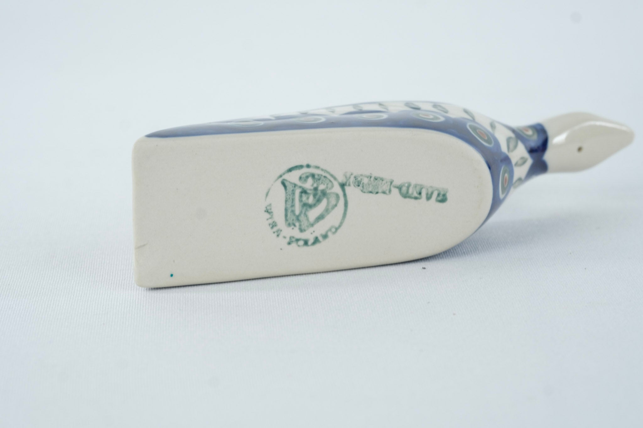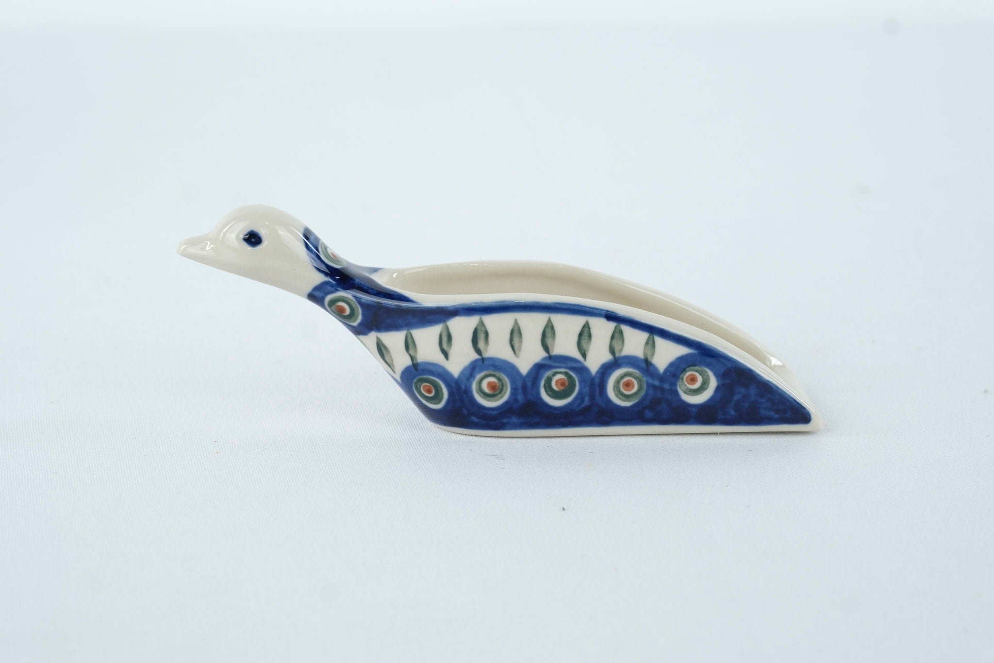 This is a charming hand-painted Polish pottery dish in the shape of a stylized bird, featuring the classic peacock feather motif in rich cobalt blue, green, and red. Stamped on the underside, this piece was crafted in Poland using traditional methods. Its elongated form makes it perfect as a decorative accent, trinket dish, or small serving piece.