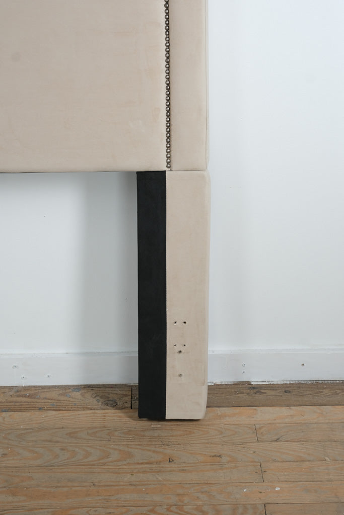 Expertly upholstered in a smooth, durable fabric, this headboard showcases a sculpted top edge accentuated by a hand-applied nailhead border. The solid frame provides dependable stability, while the cushioned padding ensures lasting comfort and support when reading or relaxing in bed.