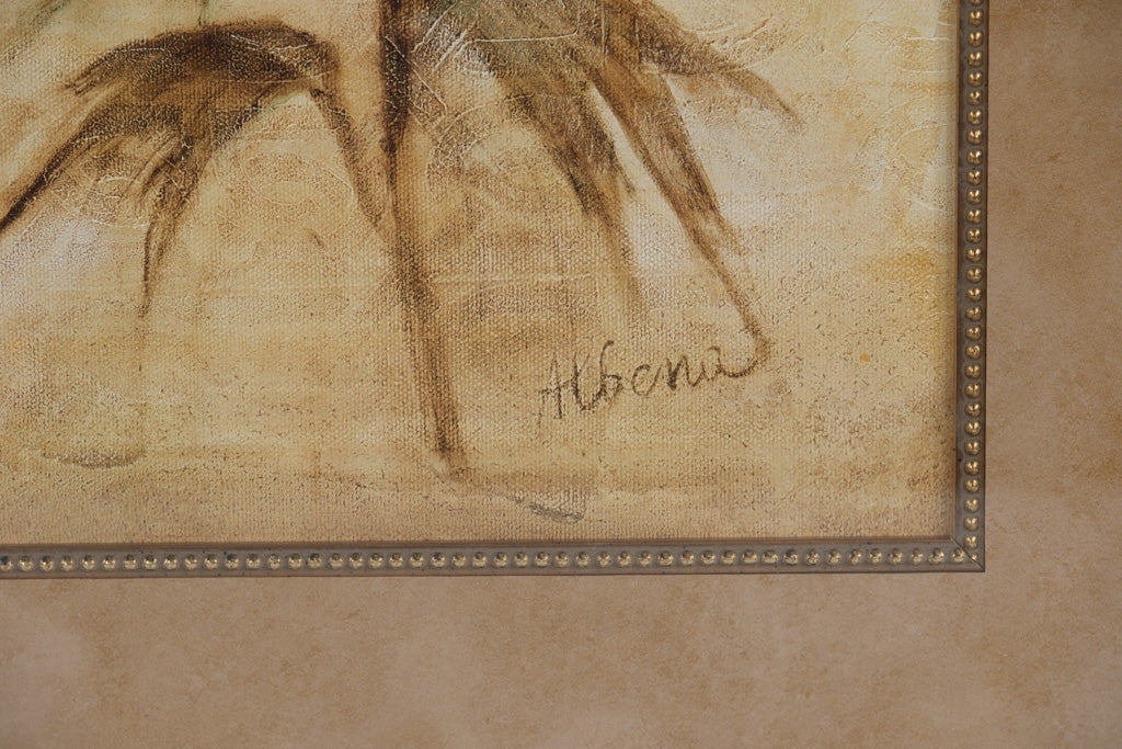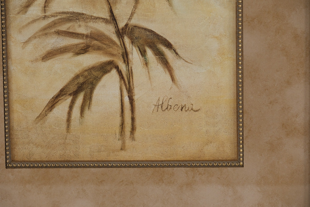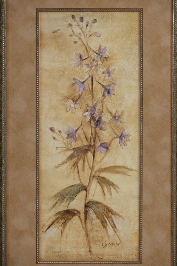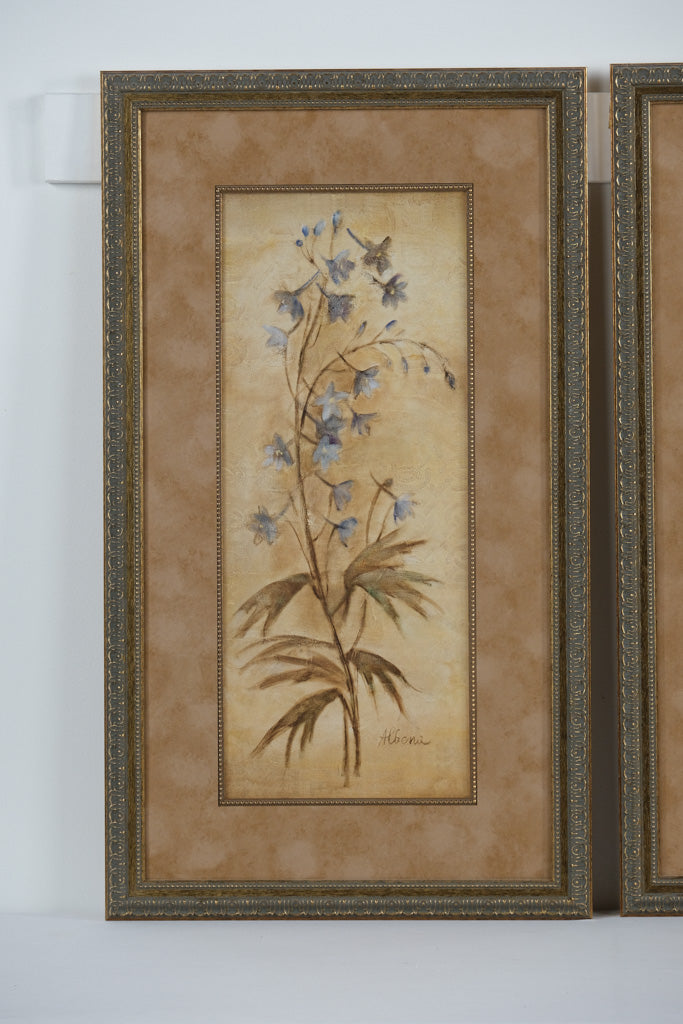 Delicate and graceful, this coordinated set of framed botanical prints by artist Albena brings a touch of timeless elegance to any room. Each piece showcases painterly stems of soft blue and lavender wildflowers rendered on a warm parchment-toned background, evoking the look of classic pressed botanical illustrations. The textured mats in a muted tan suede finish enhance the artworkβs vintage charm, while the ornate gold-and-gray frames add sophistication and depth. Perfect for bedrooms, hallways, or living spaces, these pieces create a soothing, nature-inspired atmosphere with refined artistry.
