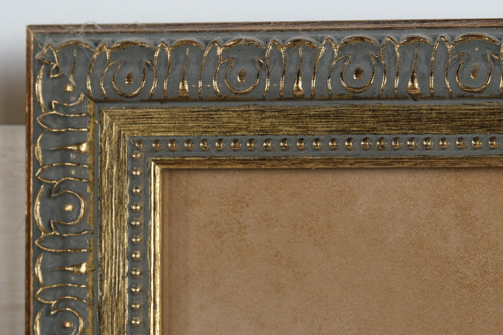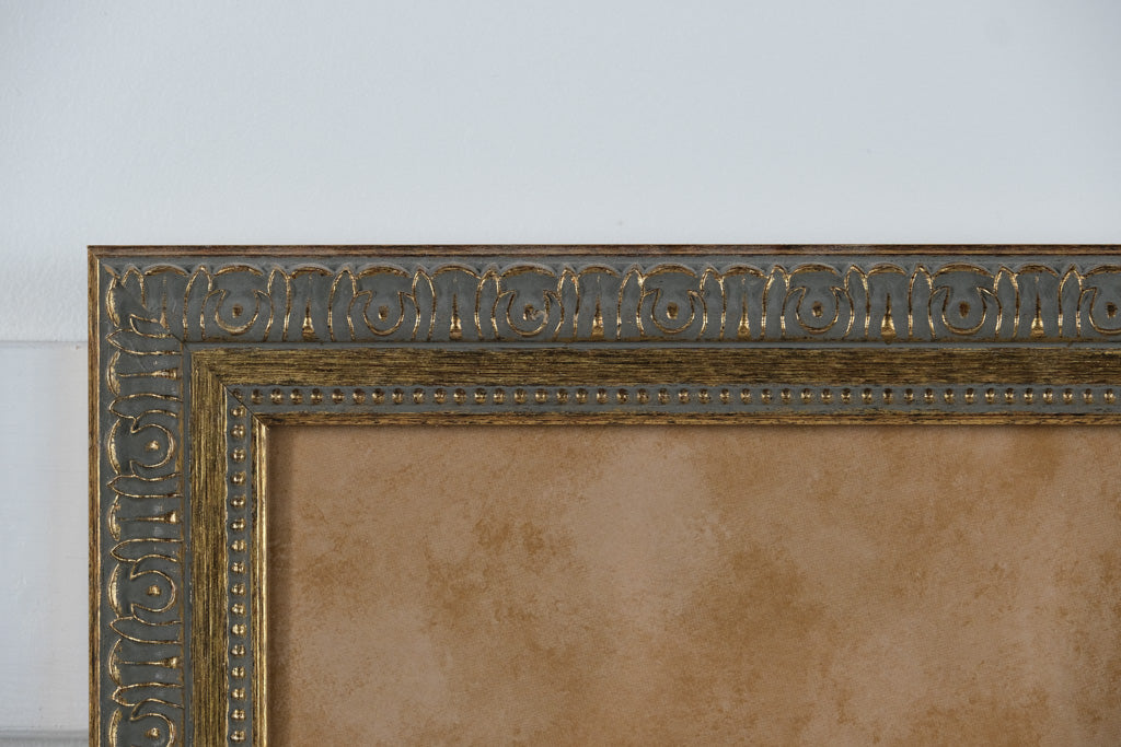 Textured tan suede-look mats and elegant carved gold-gray frames