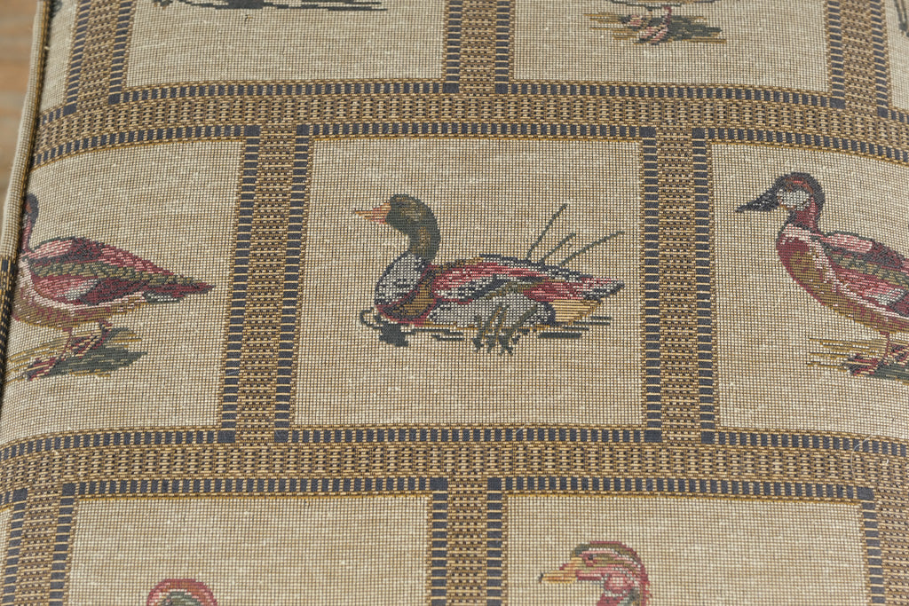 Each stool features a solid wood frame with turned legs, offering sturdy construction and timeless appeal. The upholstered tops are covered in a woven tapestry fabric depicting mallard ducks within a bordered grid pattern, highlighting fine textile artistry and a nostalgic English-country sensibility.