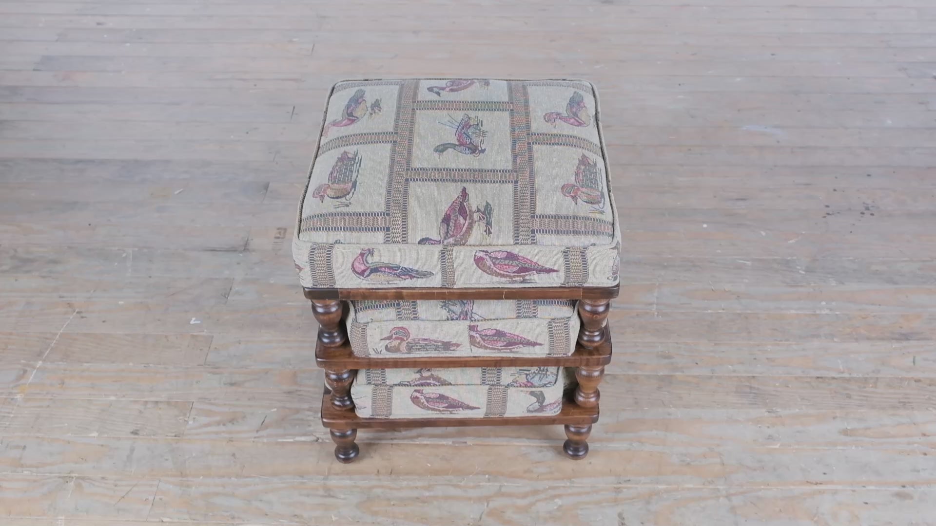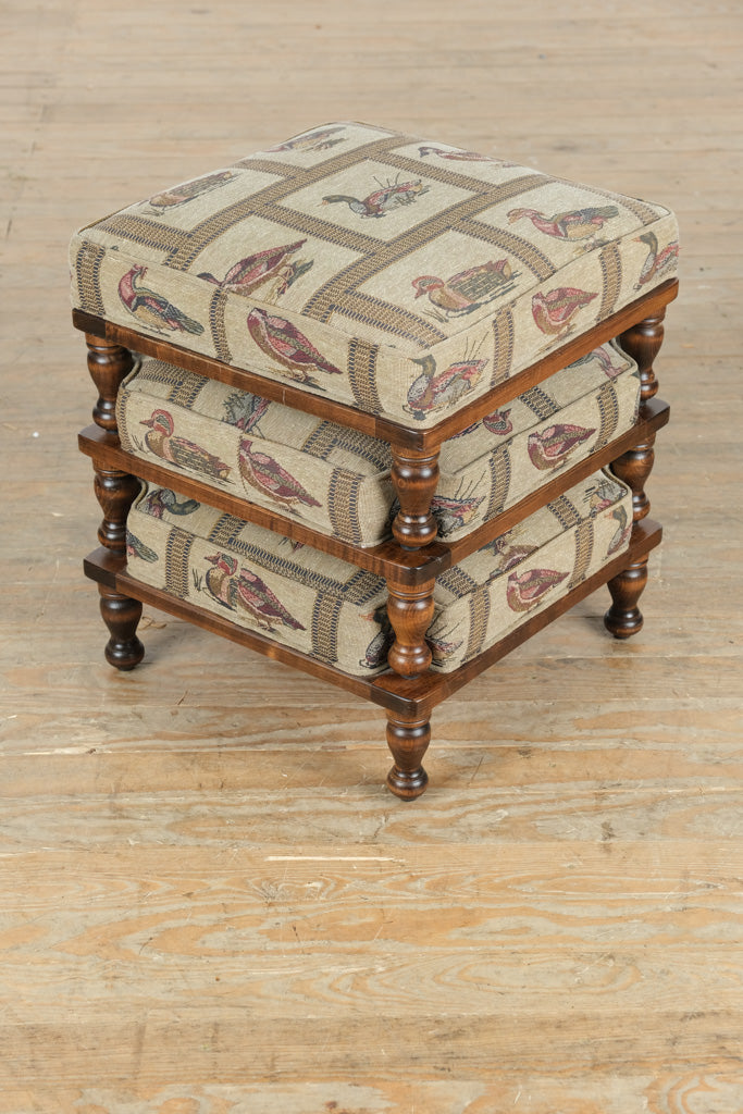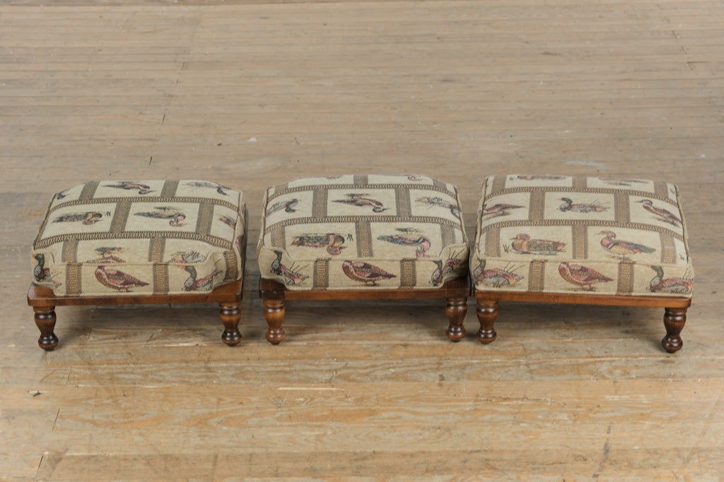 A charming trio of vintage stacking footstools, each upholstered in a classic tapestry fabric featuring colorful mallard duck motifs. The richly detailed pattern brings a touch of countryside warmth and character, perfectly complemented by the traditional turned wooden legs and smooth walnut-toned finish. Designed for both practicality and aesthetic appeal, this coordinated set combines rustic charm with refined craftsmanship.