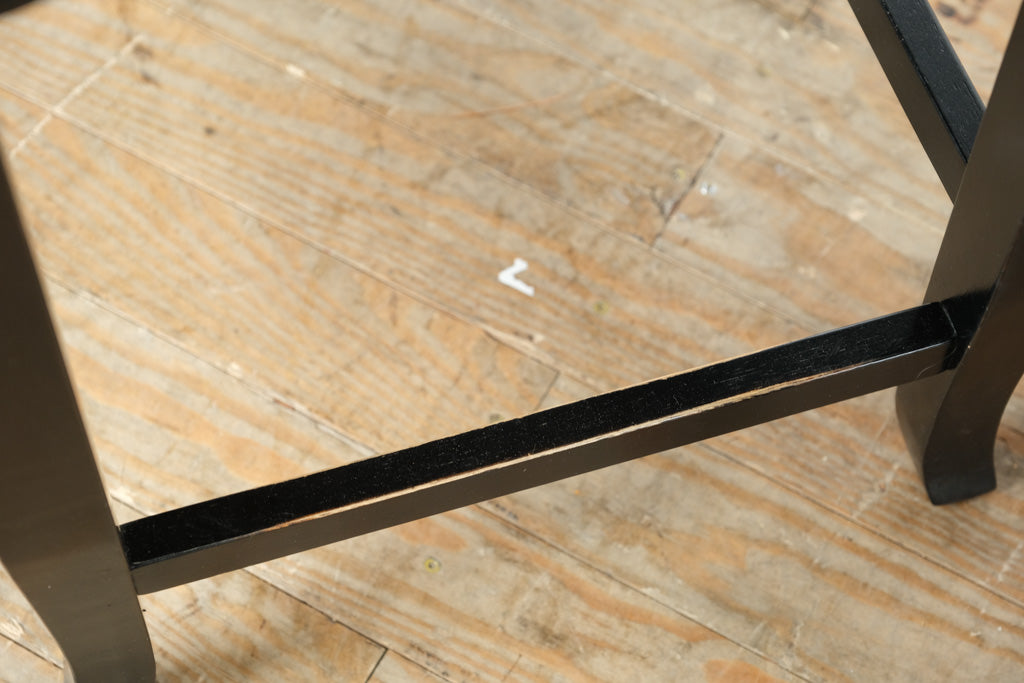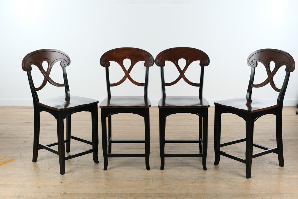 Expertly built with solid wood construction, each stool features a contoured seat for comfort and a gracefully scrolled backrest with carved detailing that forms an elegant looped motif. The sturdy stretcher base ensures stability and long-lasting durability, while the rich lacquered finish showcases the natural beauty of the wood grain.