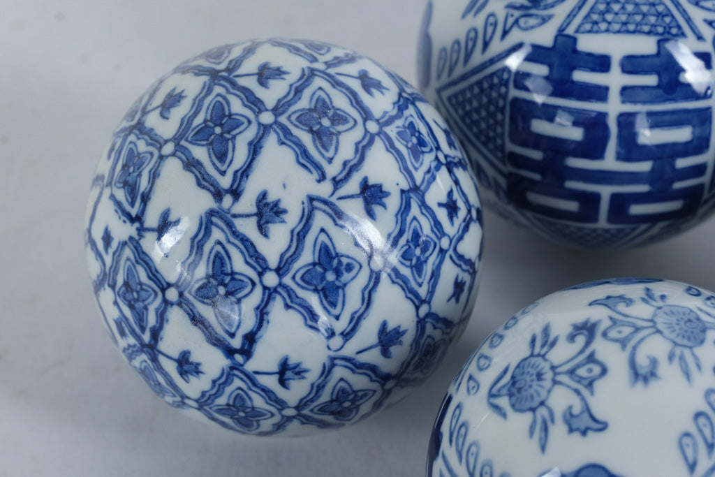 Add timeless elegance to your home décor with this set of seven blue and white porcelain decorative balls. Each sphere is beautifully hand-painted with intricate floral and geometric motifs, inspired by classic chinoiserie and Ming-style artistry. The glossy porcelain finish and deep cobalt patterns make these pieces ideal for display in bowls, trays, or glass vases. Perfect for adding a touch of sophistication to coffee tables, bookshelves, or entryway décor.