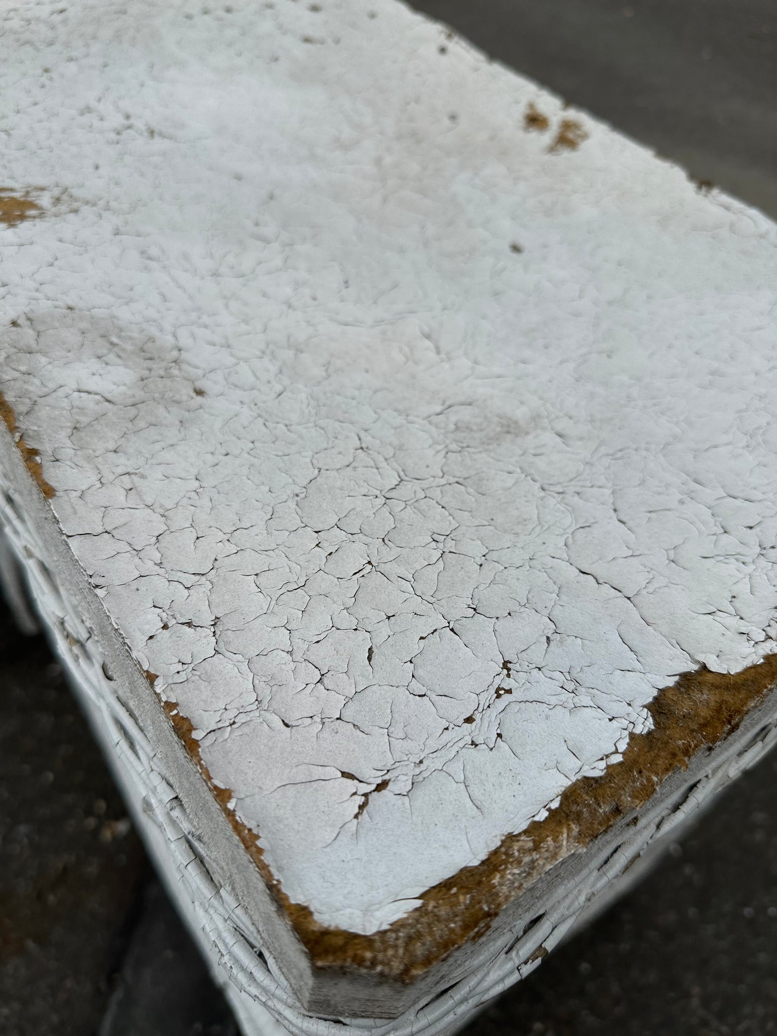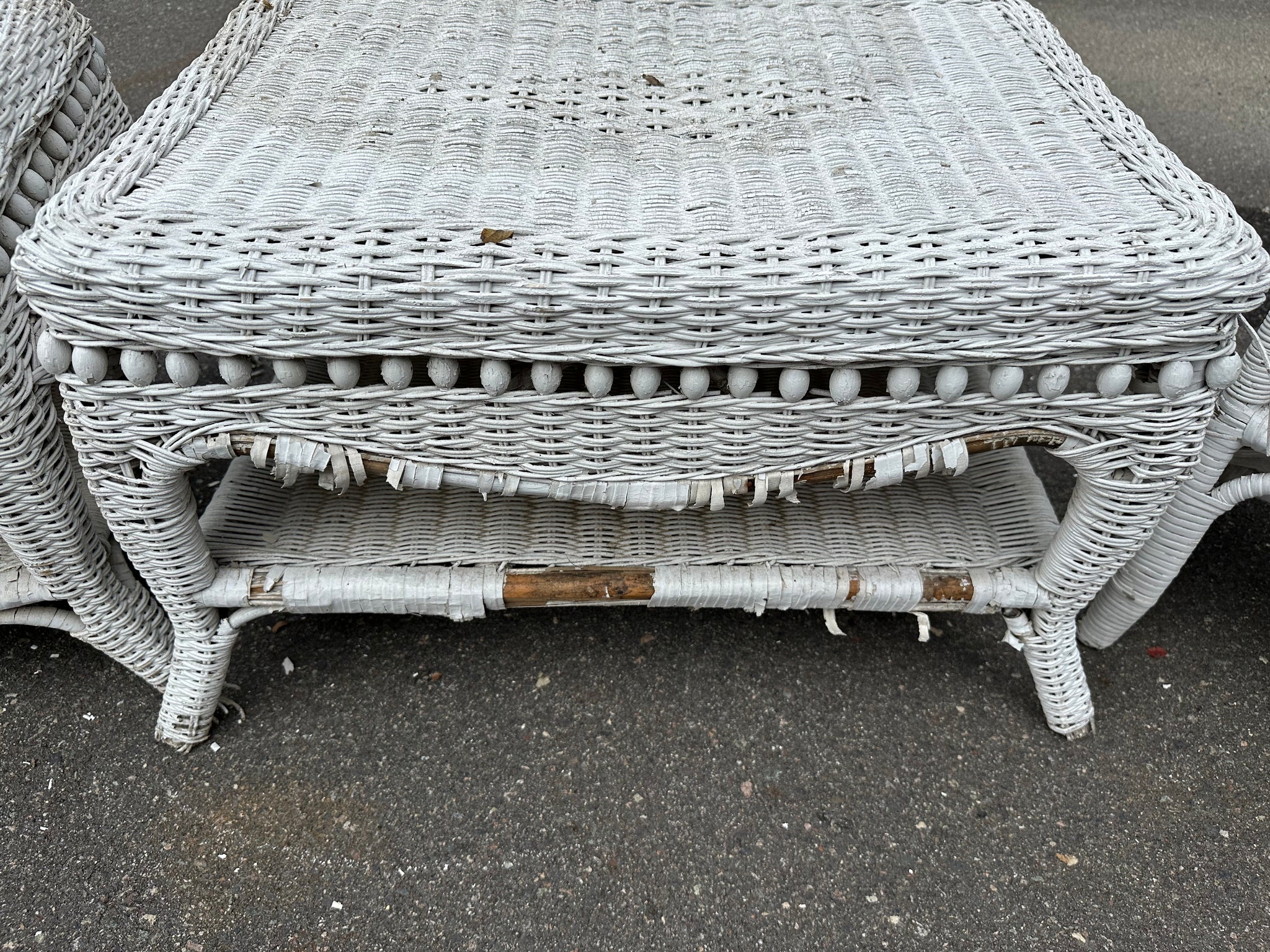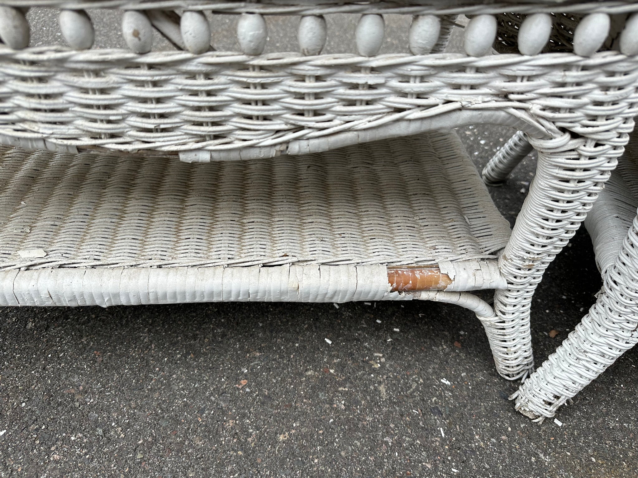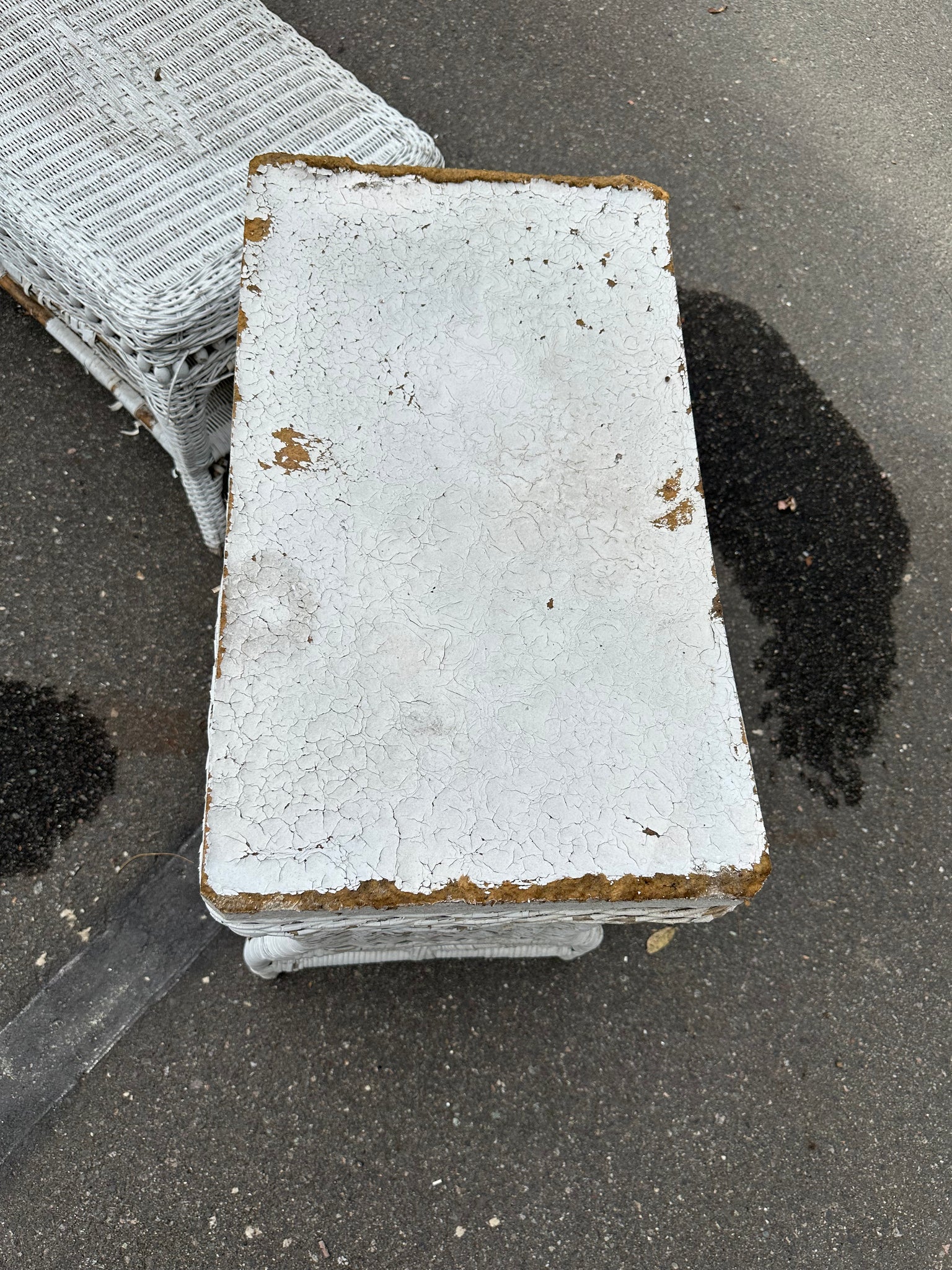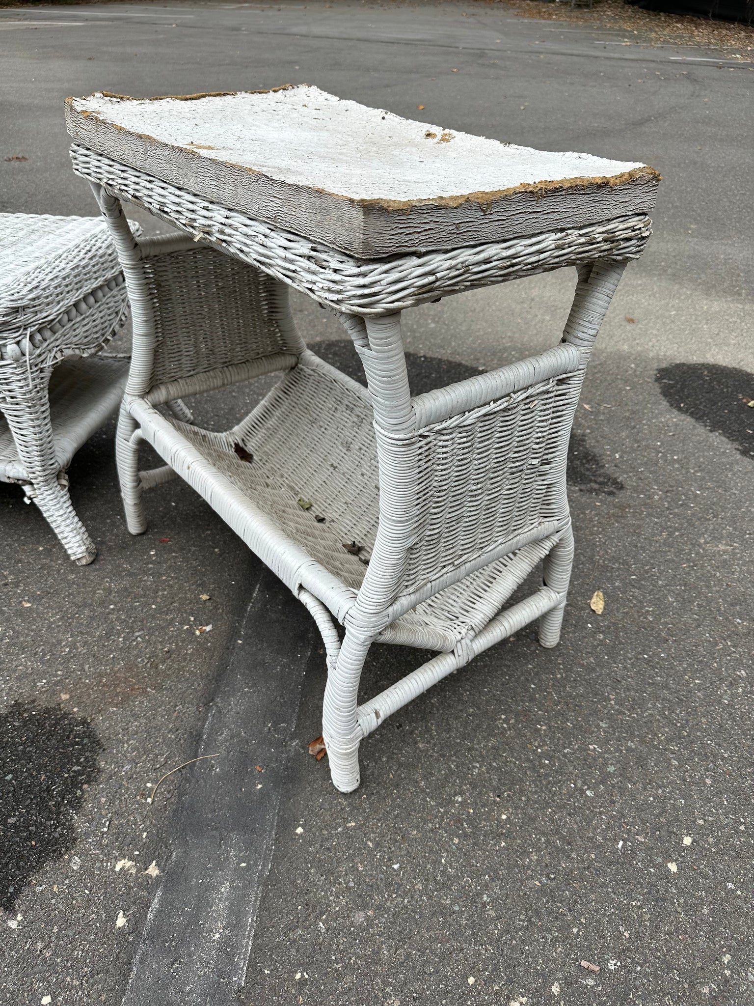 All pieces are sturdy but well-loved, showing wear, chipping, and missing wicker in spots. The top of the magazine table is water-damaged and will need to be replaced — making this set ideal for a fun DIY or upcycling project. A little creativity and paint could bring them right back to life.