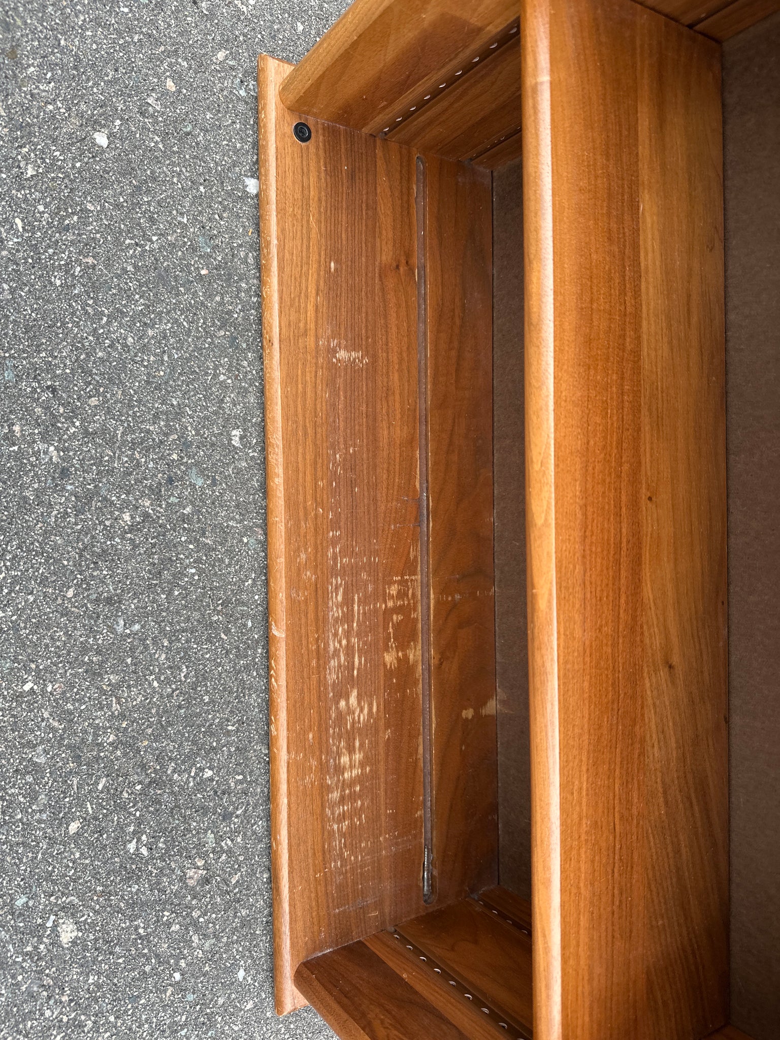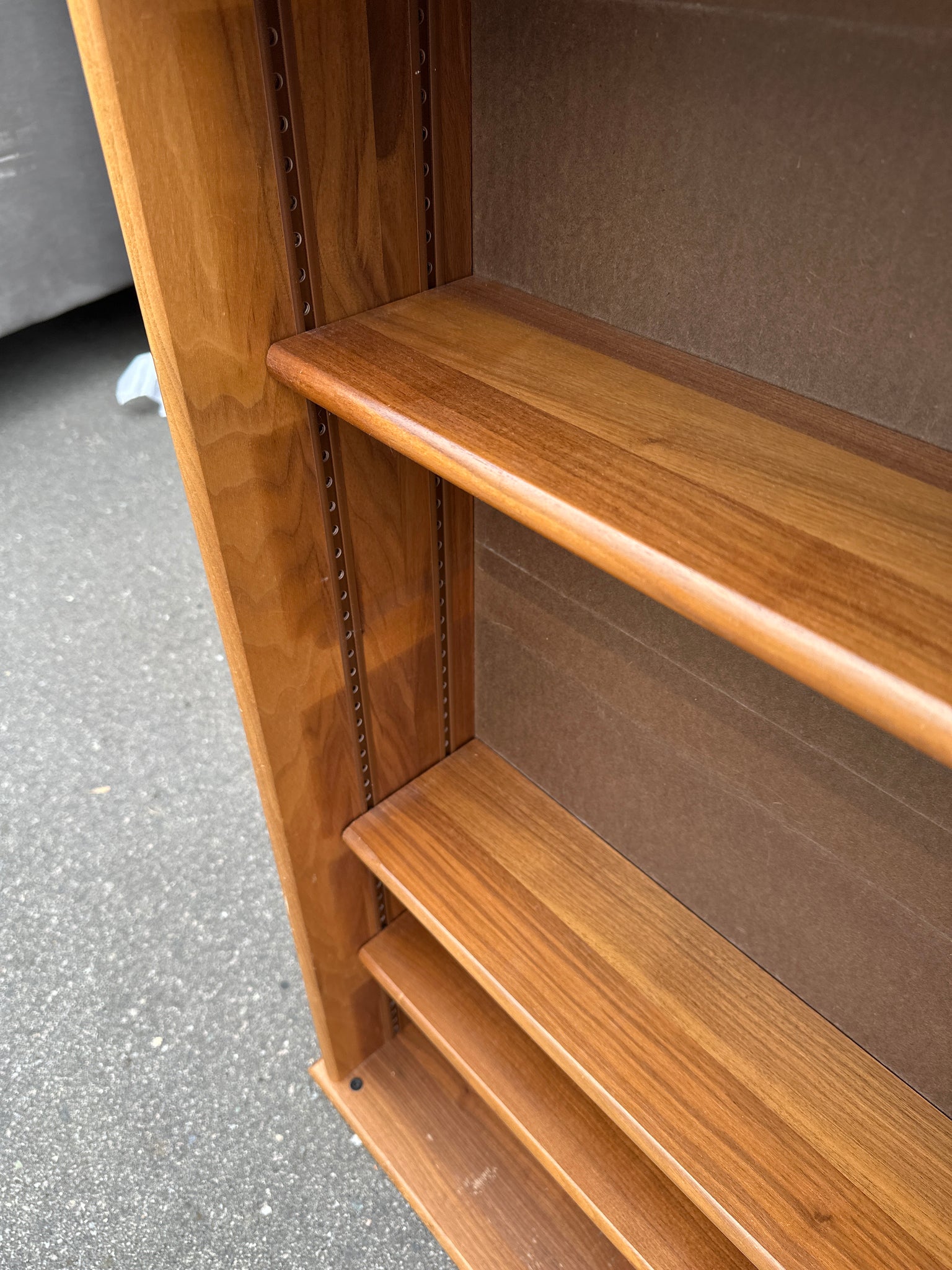 Made from solid wood and veneer, this cabinet features smooth rounded edges, a warm honey-brown finish, and thoughtfully spaced adjustable shelves for flexible storage options. It originally included a glass-front door, which is no longer present, giving the piece an open-shelf appeal that works well for displaying small books, media, or collectibles.