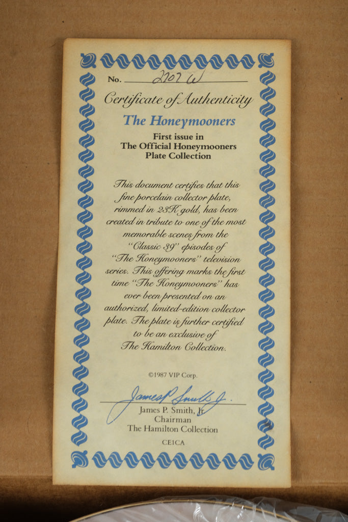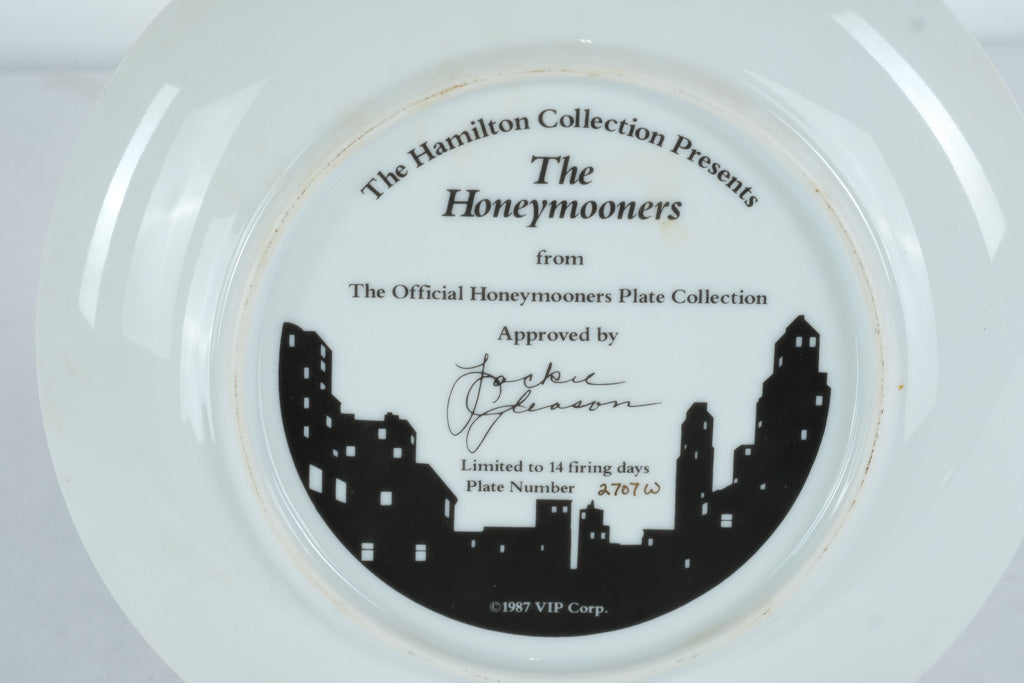 Start your collection with “The Honeymooners,” the first issue in The Official Honeymooners Plate Collection by the Hamilton Collection. This fine porcelain plate, accented in 24K gold, captures Ralph, Alice, and the gang in one of their most classic moments. The plate includes its Certificate of Authenticity and original protective box — carefully stored since issue.