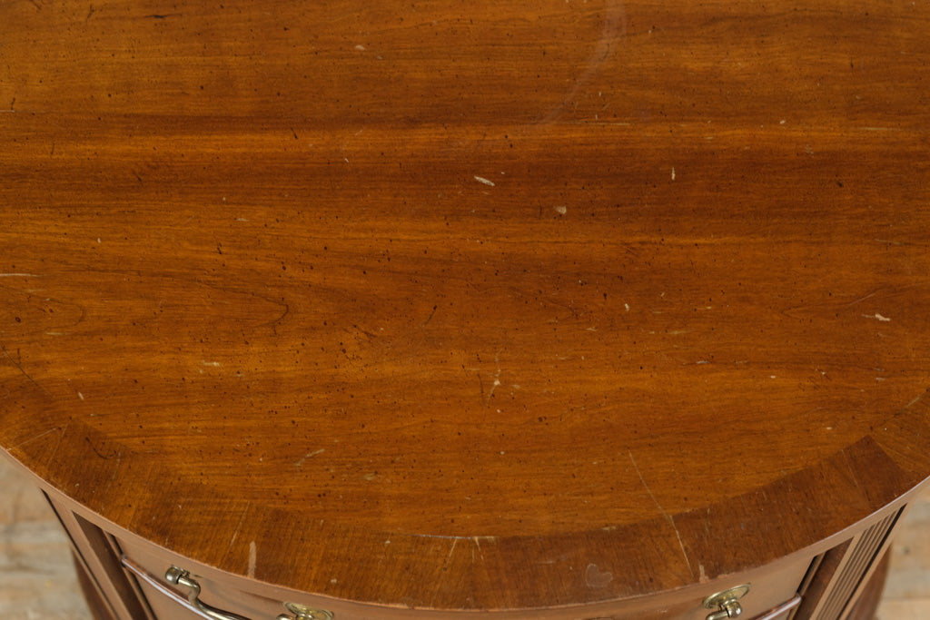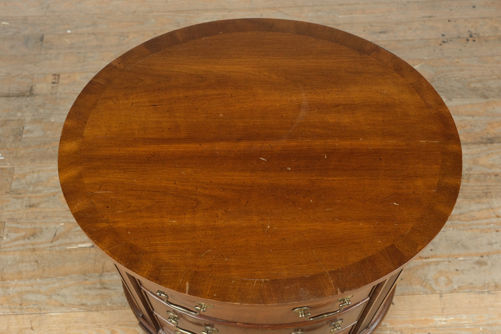 Expertly constructed by Thomasville Furniture, this table features a solid wood frame with a warm mahogany veneer that showcases natural grain patterns. The three drawers are gracefully curved to match the table’s rounded form, each adorned with solid brass pulls that lend a distinguished touch. Fine joinery and a smoothly polished finish highlight Thomasville’s reputation for enduring craftsmanship.